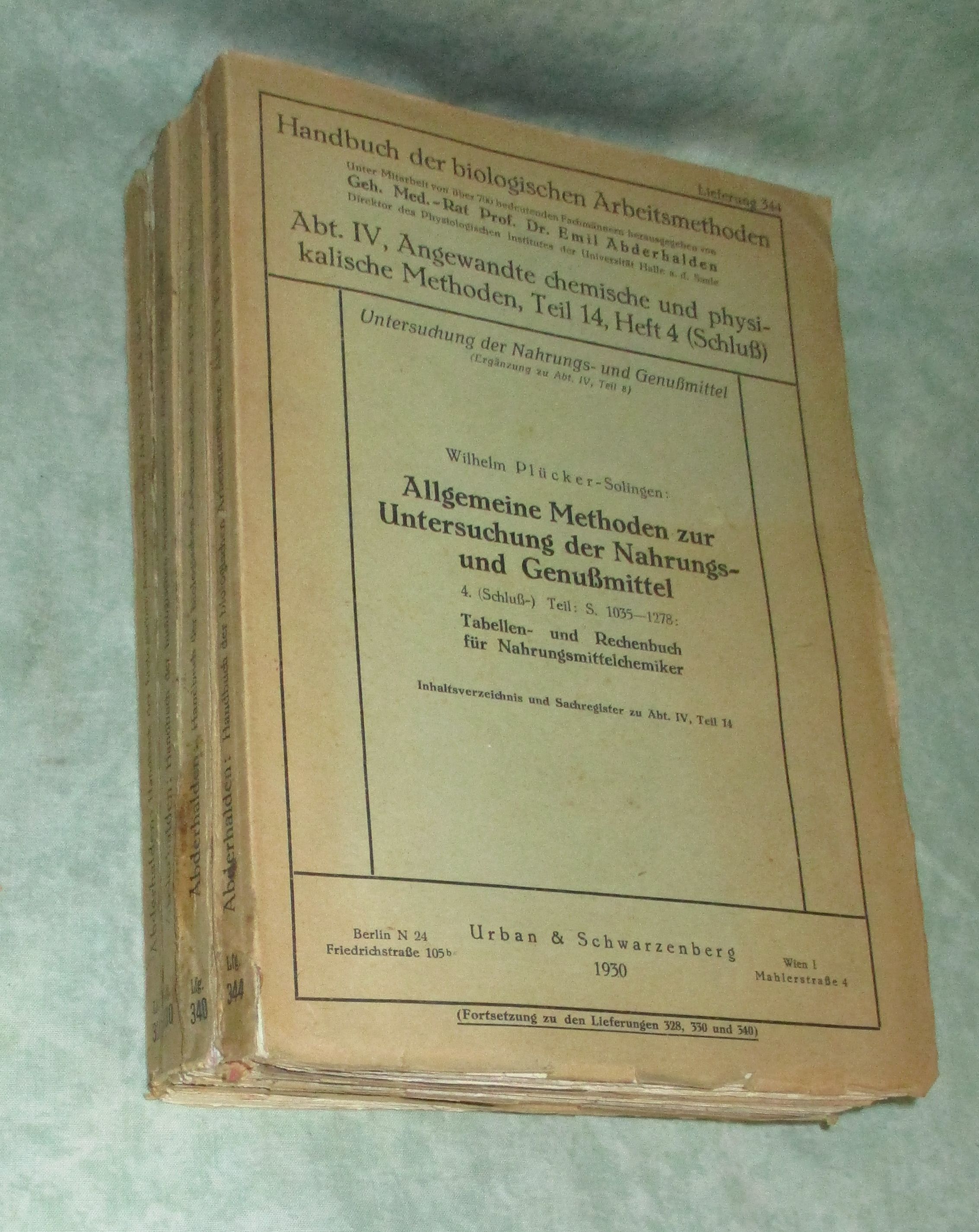 Chemische Technologie Plücker, Wilhelm. Allgemeine Methoden zur Untersuchung der Nahrungs- und Genußmittel. 4 Bände. Wien. Urban & Schwarzenberg. 1930. 1278 Seiten. Interimsbrosch. Zum Teil noch unaufgeschnitten. Abderhalden, Handbuch der biologischen Arbeitsmethoden. Abt. IV, Angewandte chemische und physikalische Methoden, Teil 14, 1-4.