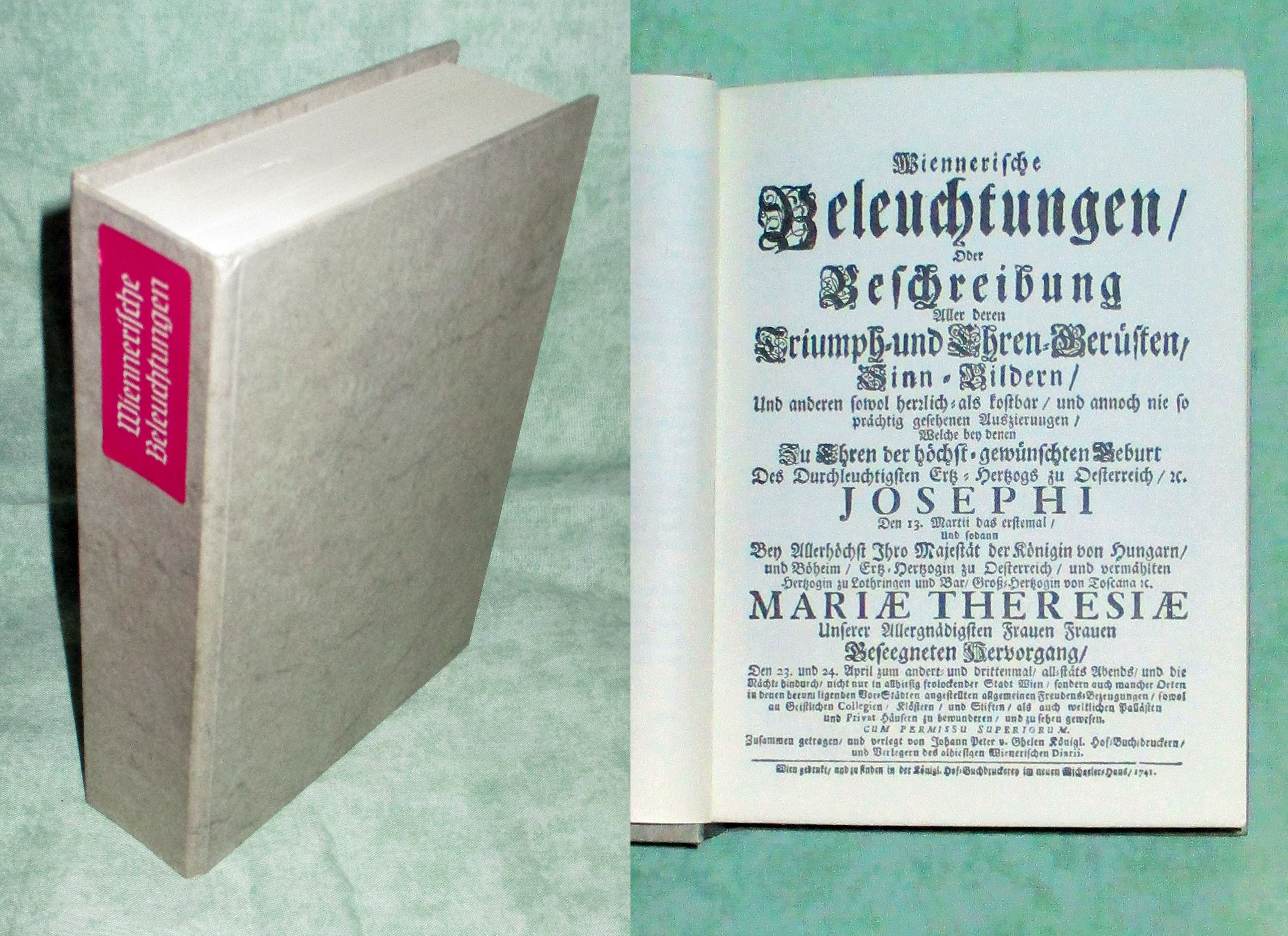 Wien – Landeskunde Ghelen, Johann Peter von. Wiennerische Beleuchtungen oder Beschreibung aller deren Triumph- und Ehren-Gerüsten, Sinn-Bildern und anderen sowohl herzlich – als kostbar und annoch nie so prächtig gesehenen Auszierungen, welche bey denen zu Ehren der höchst-gewünschten Geburt des durchleuchtigsten Erz-Herzogs zu Oesterreich Joseph I. den 13. Martii das erstemal und sodann bey allerhöchst ihro Majestät ….Mariae Theresiae…….nicht nur in allhiesig frolockenden Stadt Wien, sondern auch mancher Orten in denen herum ligenden Vor-Städten angestellten Freudens-Bezeugungen, sowol an Geistlichen Collegien, Klöstern und Stiften als auch weltlichen Pallästen und Privat Häusern zu bewundern und zu sehen gewesen. Faks.-Ausg. [der Ausg.] Wien, Ghelen, 1741 Wien, Wiener Bibliophilen-Ges., 1978. 8°. 319 Seiten. Pappband. Gutes Ex. Jahresgabe / Wiener Bibliophilen-Gesellschaft ; 1978 Faksimileausgabe der Huldigungsschrift. In einer Auflage von 350 Ex. erschienen.
