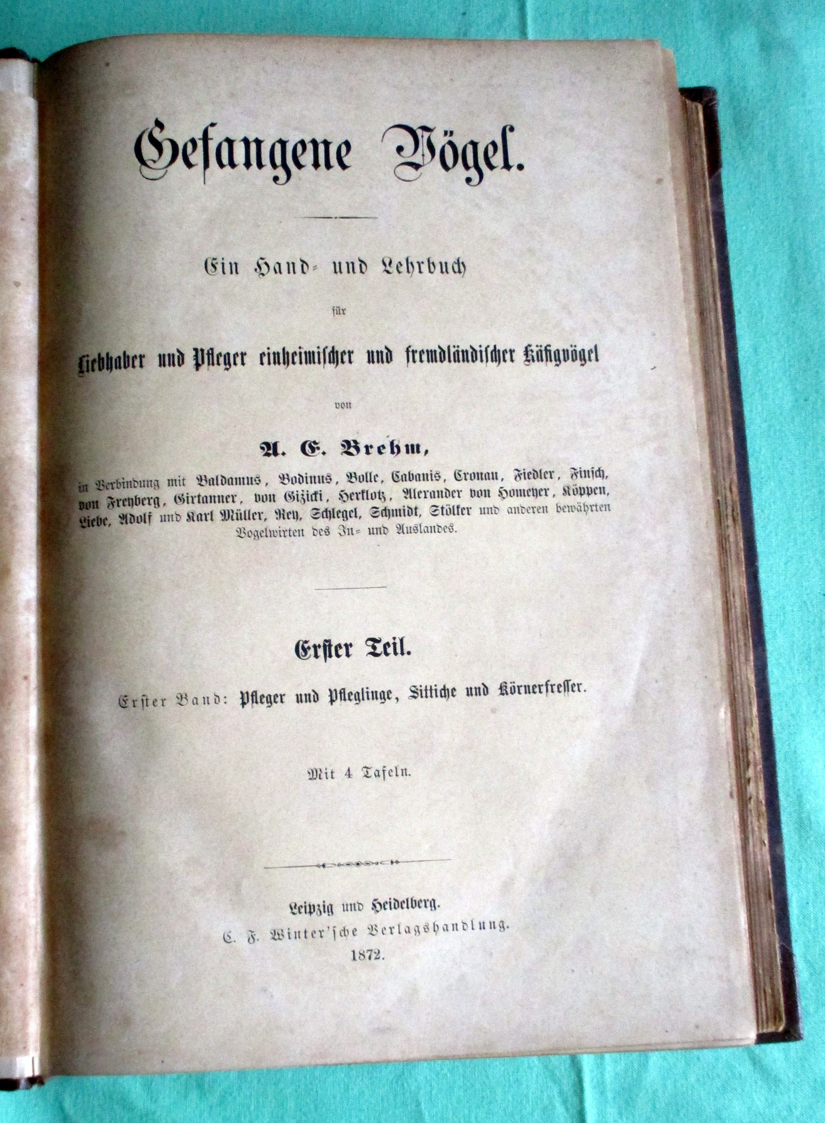 Stubenvögel-, Geflügel-, und Taubenliteratur Brehm, A.E. Gefangene Vögel. Ein Hand- und Lehrbuch für Liebhaber und Pfleger einheimischer und fremdländischer Käfigvögel. Erster Teil. Erster Band: Pfleger und Pfleglinge, Sittiche und Körnerfresser. Leipzig und Heidelberg. Winter’sche Verlagshandlung. 1872. VIII. 626 Seiten, 4 Tafeln. Gepr. Originalleinenband mit goldgepr. Titel und Rücken. Leicht berieben, erste und letzte Seiten gering stockfleckig, gesamtgesehen gutes Ex.!