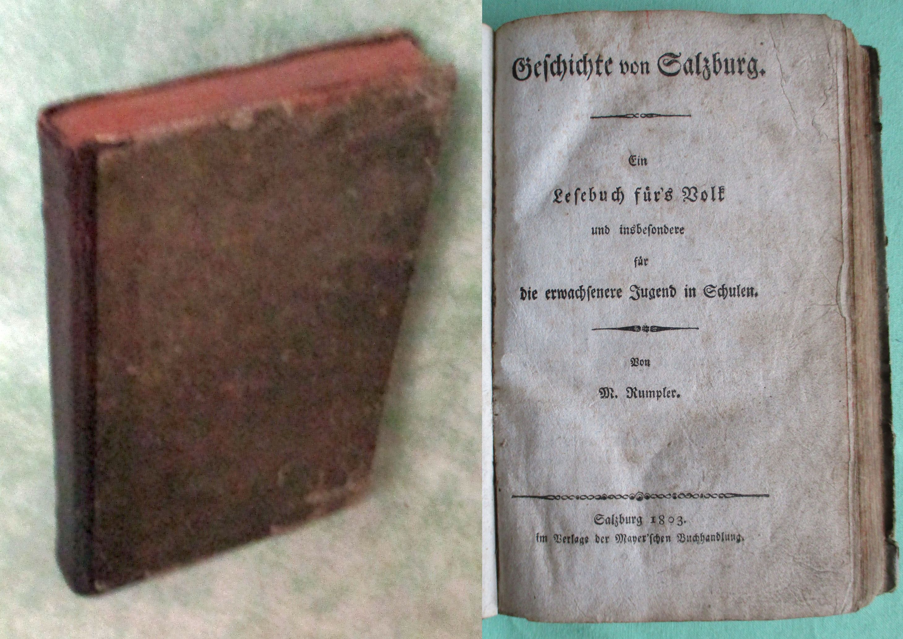 Salzburg – Orts- und Landeskunde Rumpler, Matthias. Geschichte von Salzburg. Ein Lesebuch für’s Volk und insbesondere für die erwachsenere Jugend in Schulen. Salzburg. Mayersche Buchhandlung. 1803. VI. 216 Seiten. Halbleder der Zeit. Kanten bestoßen, jedoch in altersgemäßem gutem Zustand. Am Vorsatz Besitzvermerk von alter Hand: „Heinrich Egger Gastwirt von Schwarzach gehörig“