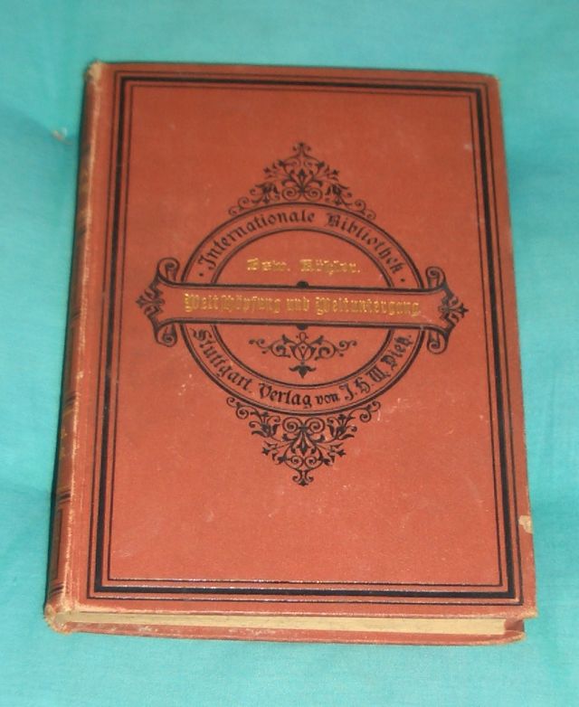 Naturwissenschaften – Chemie – Physik -Mathematik Köhler, Oswald: Weltschöpfung und Weltuntergang. Die Entwicklung von Himmel und Erde auf Grund der Naturwissenschaften aus dargestellt. Stuttgart, Dietz, 1887. 4. XVI, 336 Seiten, 47 Abb. Goldgepr. Originalleinen. Leicht berieben und bestossen,Stempel am Innendeckel, insgesamt gutes Ex. Internationale Bibliothek ; [3].