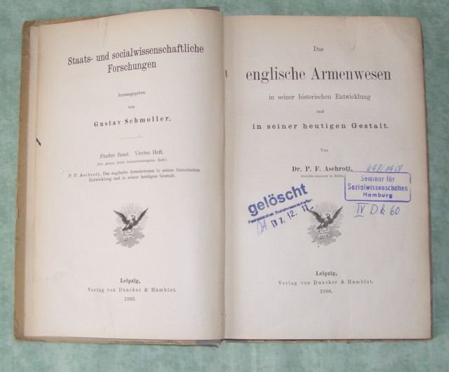 Wirtschafts- und Sozialgeschichte Aschrott, P.F. Das englische Armenwesen in seiner historischen Entwicklung und in seiner heutigen Gestalt. Leipzig. Duncker & Humblot. 1886. Schlichter Halbleinenband. exBibliotheksex. mit den obligaten Stempeln und Siglen. Ecken und Kanten stark bestossen, innen sauber und fleckenfrei. Staats- und sociualwissenschaftliche Forschungen hrsg. von Gustav Schmoller. 5. Bd. Viertes Heft.
