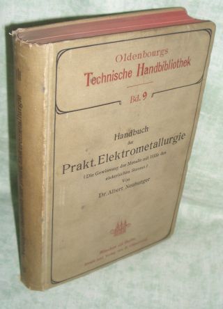 Chemische Technologie Neuburger, Albert. Handbuch der praktischen Elektrometallurgie. (die Gewinnung der Metalle mit Hilfe des elektrischen Stroms). München – Berlin. Oldenbourg, 1907. XX, 466 Seiten, 119 Textabb. Originalleinen mit Rotschnitt. Exbibliotheksex. aus der Kekulébibliothek der Farbenfabriken Leverkusen mit Exlibris und Stempel. Einband berieben und fleckig. Bindung fest, innen in gutem Zustand. Oldenbourgs technische Handbibliothek, 9.