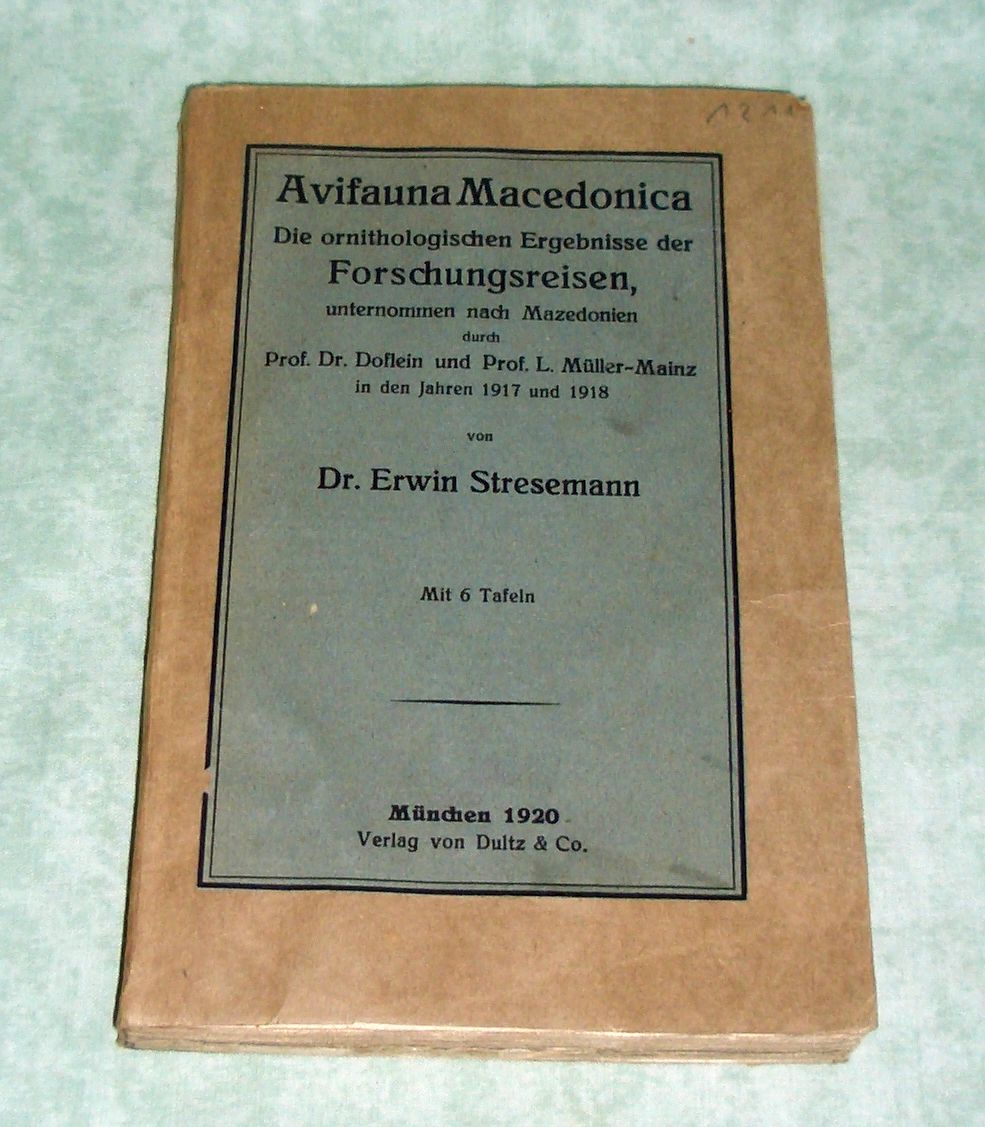 Ornithologie – Vogelkunde Stresemann, E. Avifauna Macedonica. Die ornithologischen Ergebnisse der Forschungsreisen unternommen nach Mazedonien durch Prof.Dr. Doflein und Prof. L. Müller-Mainz in den Jahren 1917 und 1918. München. Dultz. 1920. XXIV. 270 Seiten. 6 Tafeln. Spätere Bindung unter Verwendung des Originaleinbandes. Gutes Ex.