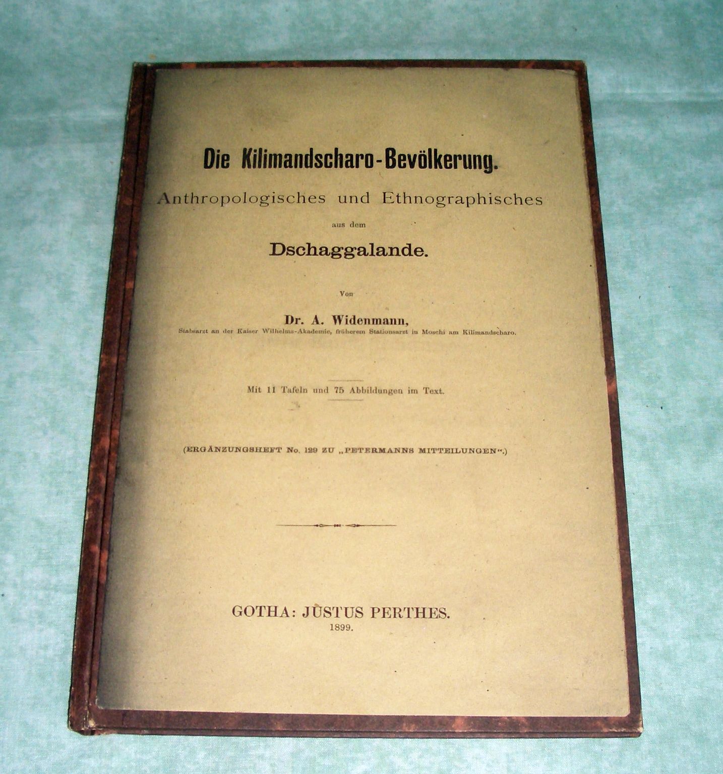 Ethnologie + Anthropologie Widenmann, A. Die Kilimandscharo-Bevölkerung. Anthropologisches und Ethnographisches aus dem Dschaggalande. 1899. VI. 104 Seiten, mit 11 Tafeln und 75 Abb. Pappband. Ein gutes Ex.! Ergänzungsheft N° 120 zu „Petersmanns Mitteilungen“.