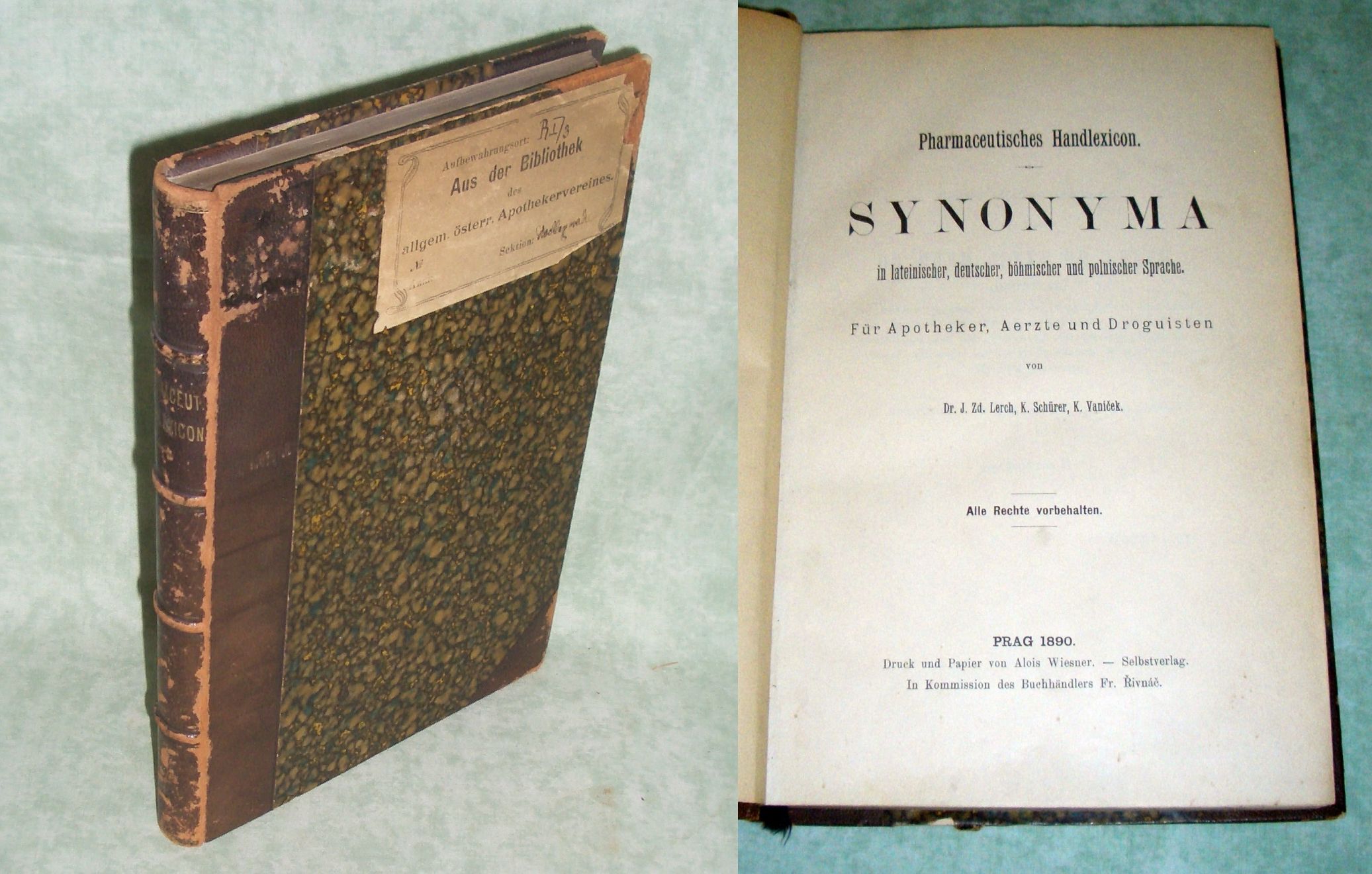 Medizin + Veterinärmedizin Lerch, Z. /Schürer, K. /Vanicek, K. Pharmaceutisches Handlexicon. Synonyma in lateinischer, deutscher, böhmischer und polnischer Sprache. Für Apotheker, Ärzte und Droguisten. Prag. Im Eigenverlag. 1890. 448 Seiten. Halbleder. Ecken und Kanten bestossen, Exlibris am Innendeckel. Etikett der Bibliothek d. österr. Apothekervereins am Einband. Innen sauber und anstreichungsfrei.