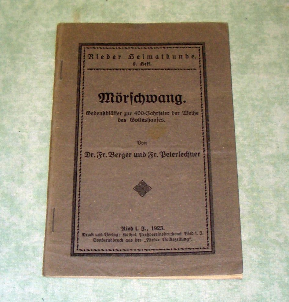 Oberösterreich – Orts- und Landeskunde Berger, F. /Peterlechner, F. Mörschwang. Gedenkblätter zur 400 Jahrfeier der Weihe des Gotteshauses. Ried im Innkreis. Kathol. Preßvereinsdruckerei. 1923. 41 Seiten. kart. Rieder Heimatkunde 9. Heft.