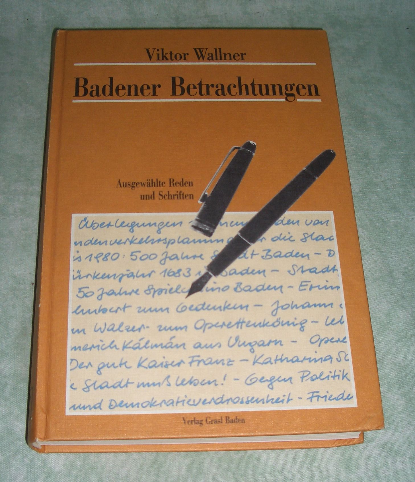 Niederösterreich – Orts- und Landeskunde Wallner, Viktor. Badener Betrachtungen. Ausgewählte Reden und Schriften. Baden. Vlg. Grasl. 1987. 328 Seiten, 32 Abb. Fest gebunden. Widmung des Autors am Vorsatz.