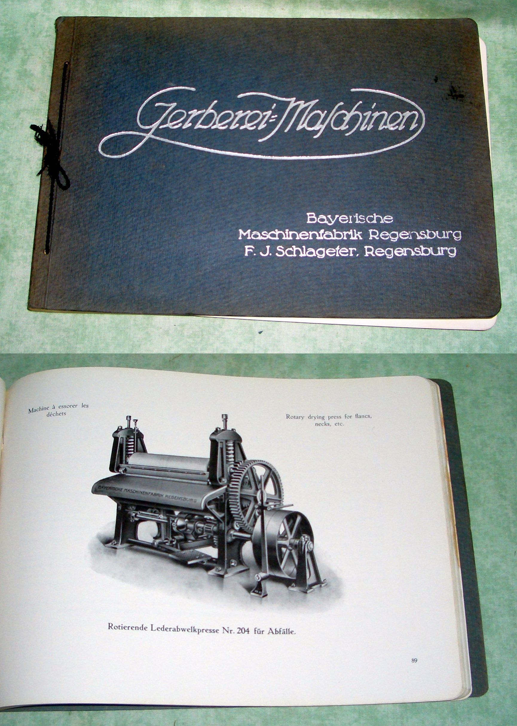 Firmengeschichte + Firmenkataloge Bayerische Maschinenfabrik Regensburg F.J. Schlageter/Regensburg. Maschinen für Gerbereien und Lederfabriken. Um 1925. 167 Seiten, durchgehend illustriert. (u.a. Werksansicht) Kordelbindung. Schnitt leicht fleckig, ansonsten in ausgezeichnetem Zustand! Beilage: Grossgerbfass „Bavaria“.