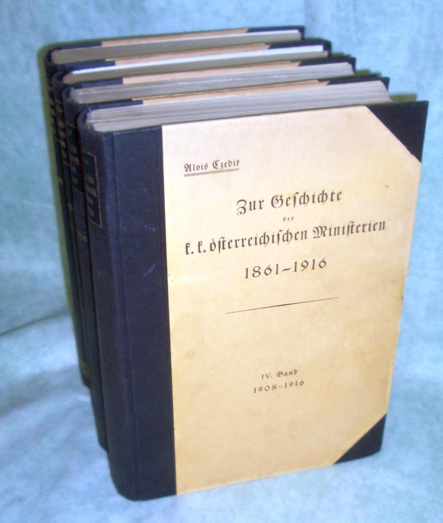 Österreich – Geschichte – Zeitgeschichte Czedik, Alois Freiherr von. Zur Geschichte der k. k. österreichischen Ministerien 1861 – 1916. Nach den Erinnerungen. I. Band: Der Zeitabschnitt 1861-1893. II. Band: 1893-1904. III. Band: 1905-1908. IV. Band: 1908-1916. 4 Bände. Teschen/Wien/Leipzig. Prochaska. 1920 8. XXX. 504. XVIII. 438. XVI.588 Seiten. Halbleinen mit goldgepr. Titelvignette. Bei Band 2 ein Innengelenk gelockert, ansonsten in sehr gutem Zustand.