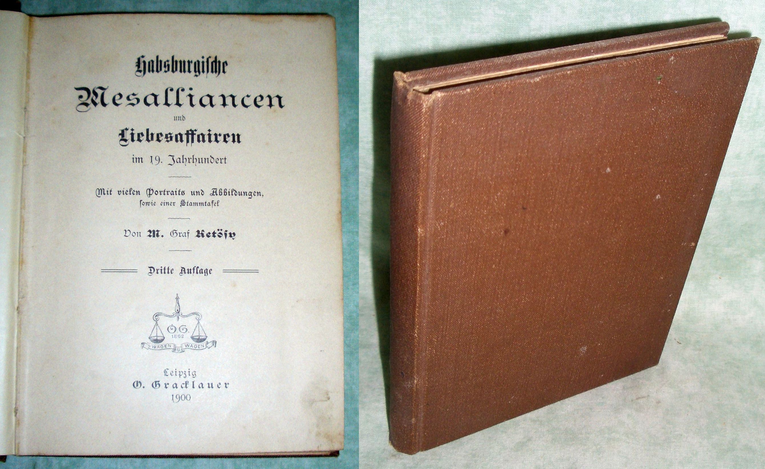 Österreich – Geschichte – Zeitgeschichte Ketösy, M. Habsburgische Mesalliancen und Liebesaffären im 19. Jahrhundert. 3. Auflage. Leipzig, Gracklauer. 1900.. Kl. 8°. 190 Seiten, mit vielen Portraits und Abbildungen, sowie ener Stammtafel. Schlichter Kunstleinenband. Einige Seiten minimal fleckig, insgesamt ein gutes Ex.