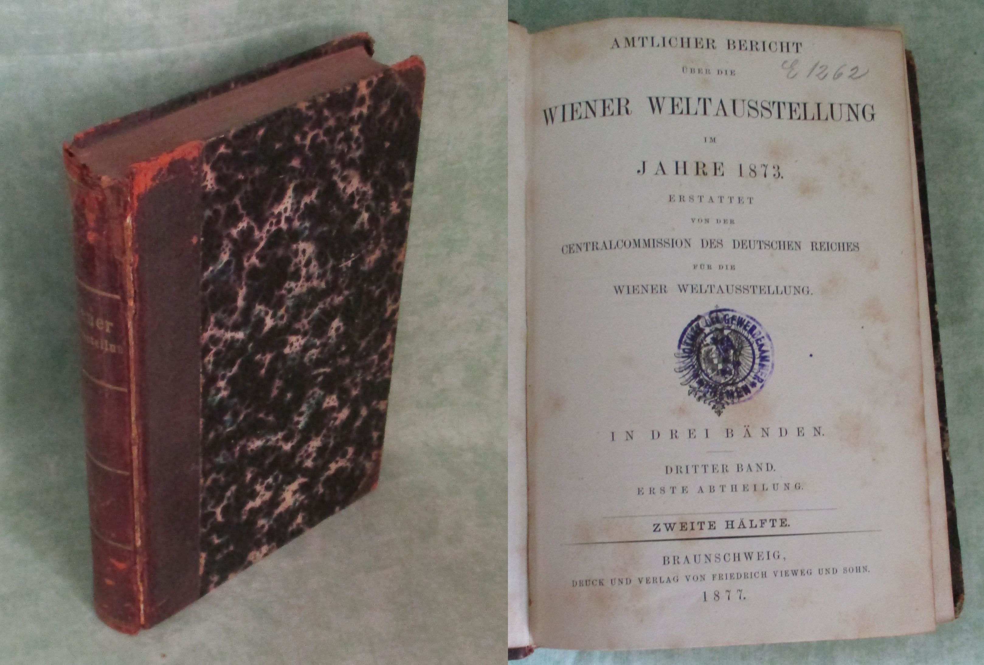 Technik + Technikgeschichte Amtlicher Bericht über die Wiener Weltausstellung im Jahre 1873. Erstattet von der Centralcommission des Deutschen Reiches für die Wiener Weltausstellung. Mit einem Rückblick auf die Entwickelung der chemischen Industrie während des letzte Jahrhunderts. Dritter Band. Erste Abtheilung. 2. Hälfte. Dritte Gruppe. Chemische Industrie. Dritte Abtheilung. Organische Verbindungen. Braunschweig, Vieweg, 1877. VIII, 526 S. Halbleder der Zeit. Rücken einseitig aufgeplatzt mit kleinem Abriss am oberen Rand. Seiten zum Teil leicht stockfleckig. Aus dem Inhalt: Materialien für die Textilindustrie (Pflanzenfasern). Materialien für die Papier-Industrie. Stärkemehl-Industrie. Rübenzuckerfabrikation. Spiritusfabrikation. Nessler: Die Bereitung des Weines (51 Seiten) Lintner, Bier: (55 Seiten).