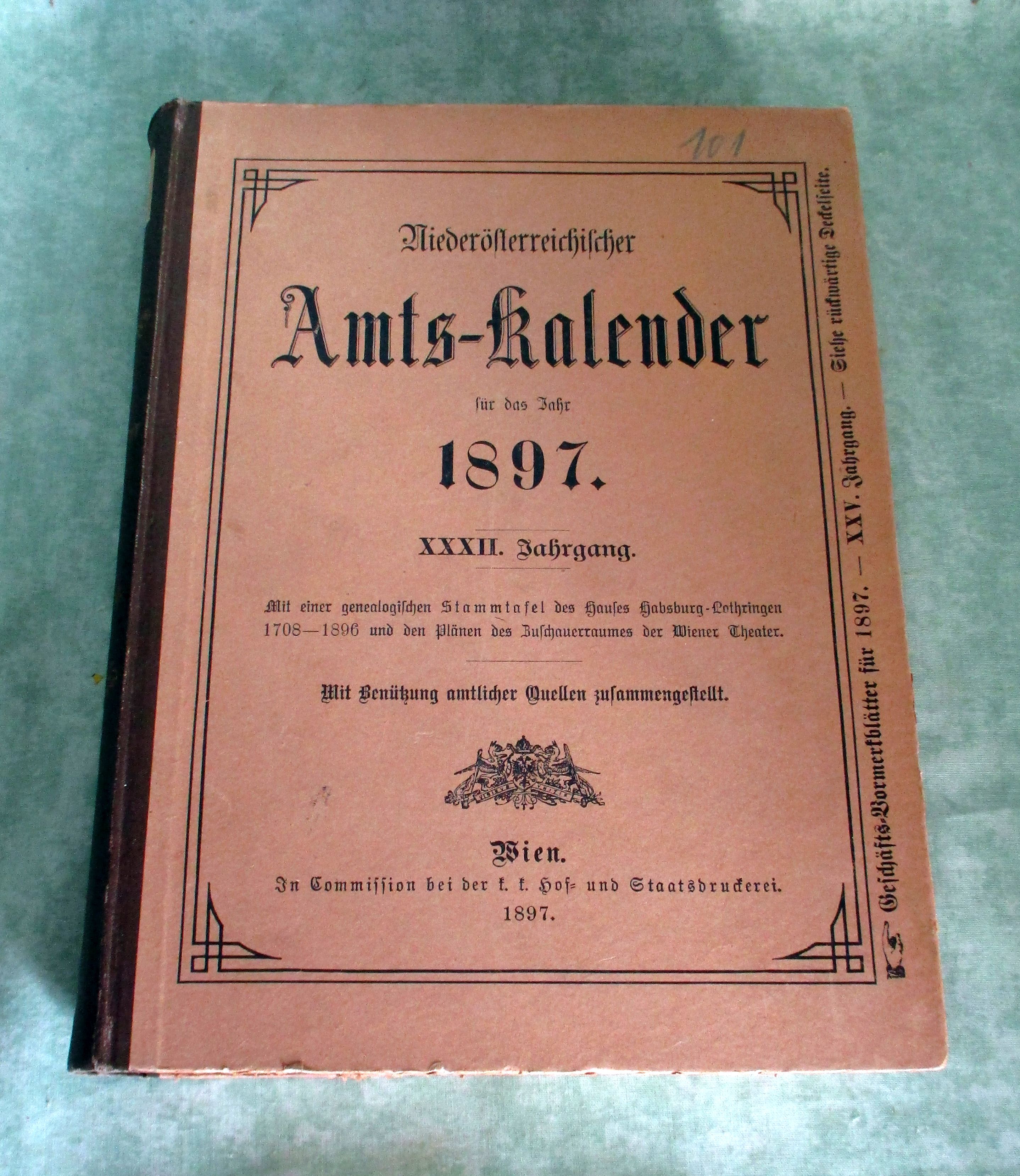 Niederösterreich – Orts- und Landeskunde Niederösterreichischer Amts-Kalender für das Jahr 1897. XXXII. Jahrgang. Mit Benützung amtlicher Quellen zusammengestellt. Mit einer genealogischen Stammtafel des Hauses Habsburg-Lothringen 1708-1896 und den Plänen des Zuschauerraumes der Wiener Theater. Wien. In Commission bei der k.k. Hof- und Staatsdruckerei. 1897. 924 Seiten. Halbleinen. Kanten leicht bestossen, ansonsten in sehr gutem Zustand. Inhalt: I. Theil: Hof. und allgemeiner Staatsschematismus. II. Theil: Niederösterreichischer Amtsschematismus. III. Zheil: Geschäftsnotizen. Da bis 1920 Wien und Niederösterreich eine Einheit waren, beinhaltet der Amtskalender auch alle Angaben zu Wien, wie Behörden, Sanitätspersonen, Kirchliche Behörden und Anstalten, Vereine, Gebühren, Theater, Zeitschriften usw.