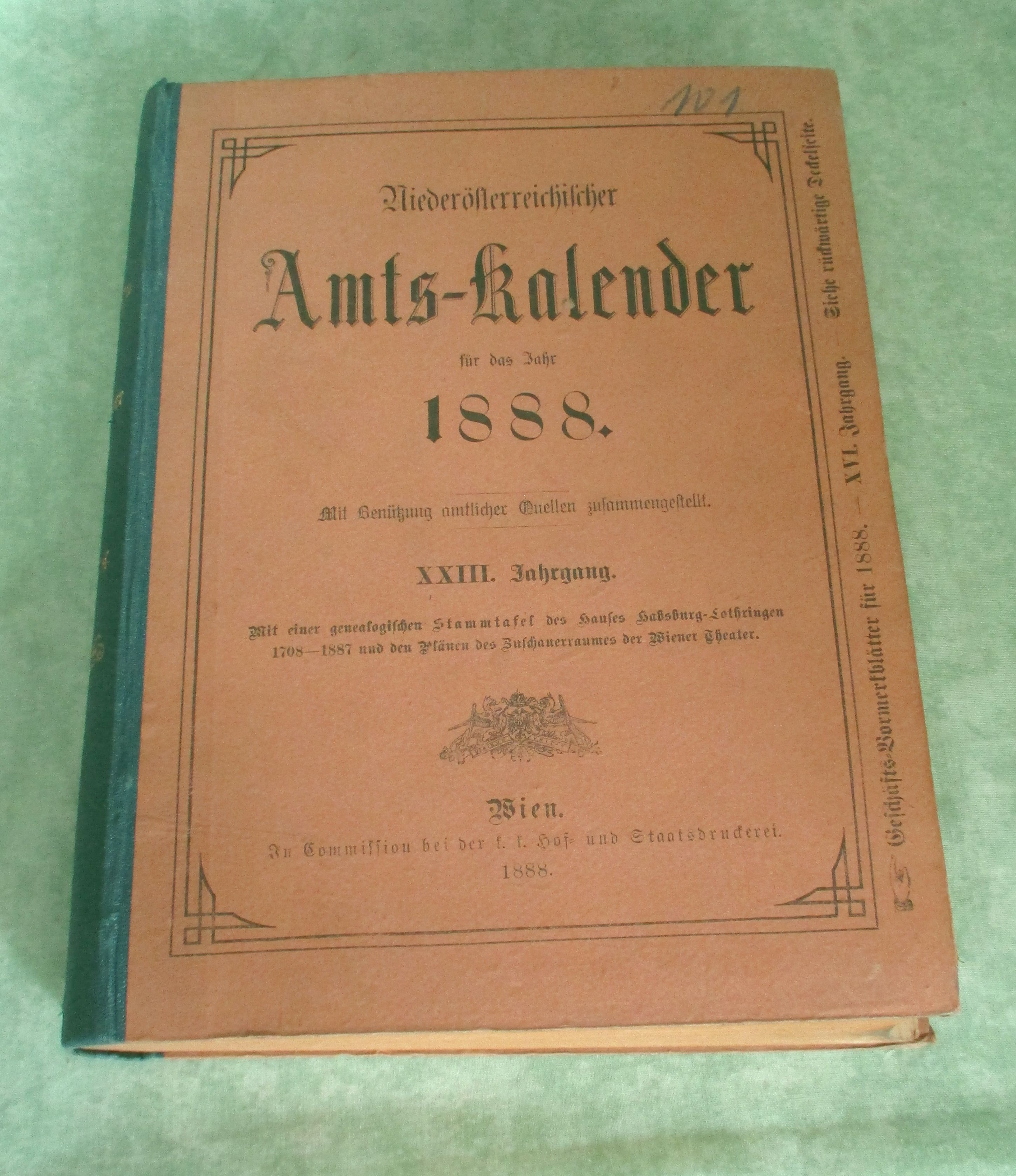 Niederösterreich – Orts- und Landeskunde Niederösterreichischer Amts-Kalender für das Jahr 1888. XXiII. Jahrgang. Mit Benützung amtlicher Quellen zusammengestellt. Mit einer genealogischen Stammtafel des Hauses Habsburg-Lothringen 1708-1887 und den Plänen des Zuschauerraumes der Wiener Theater. Wien. In Commission bei der k.k. Hof- und Staatsdruckerei. 1888. 852 Seiten. Halbleinen. Ecken bestossen, insgesamt ein gutes Ex. Inhalt: I. Theil: Hof. und allgemeiner Staatsschematismus. II. Theil: Niederösterreichischer Amtsschematismus. III.Theil: Geschäftsnotizen. Anhang: Alphabetisches Verzeichnis sämtlicher Ortschaften in Niederösterreich. Da bis 1920 Wien und Niederösterreich eine Einheit waren, beinhaltet der Amtskalender auch alle Angaben zu Wien, wie Behörden, Sanitätspersonen, Kirchliche Behörden und Anstalten, Vereine, Gebühren, Theater, Zeitschriften usw.