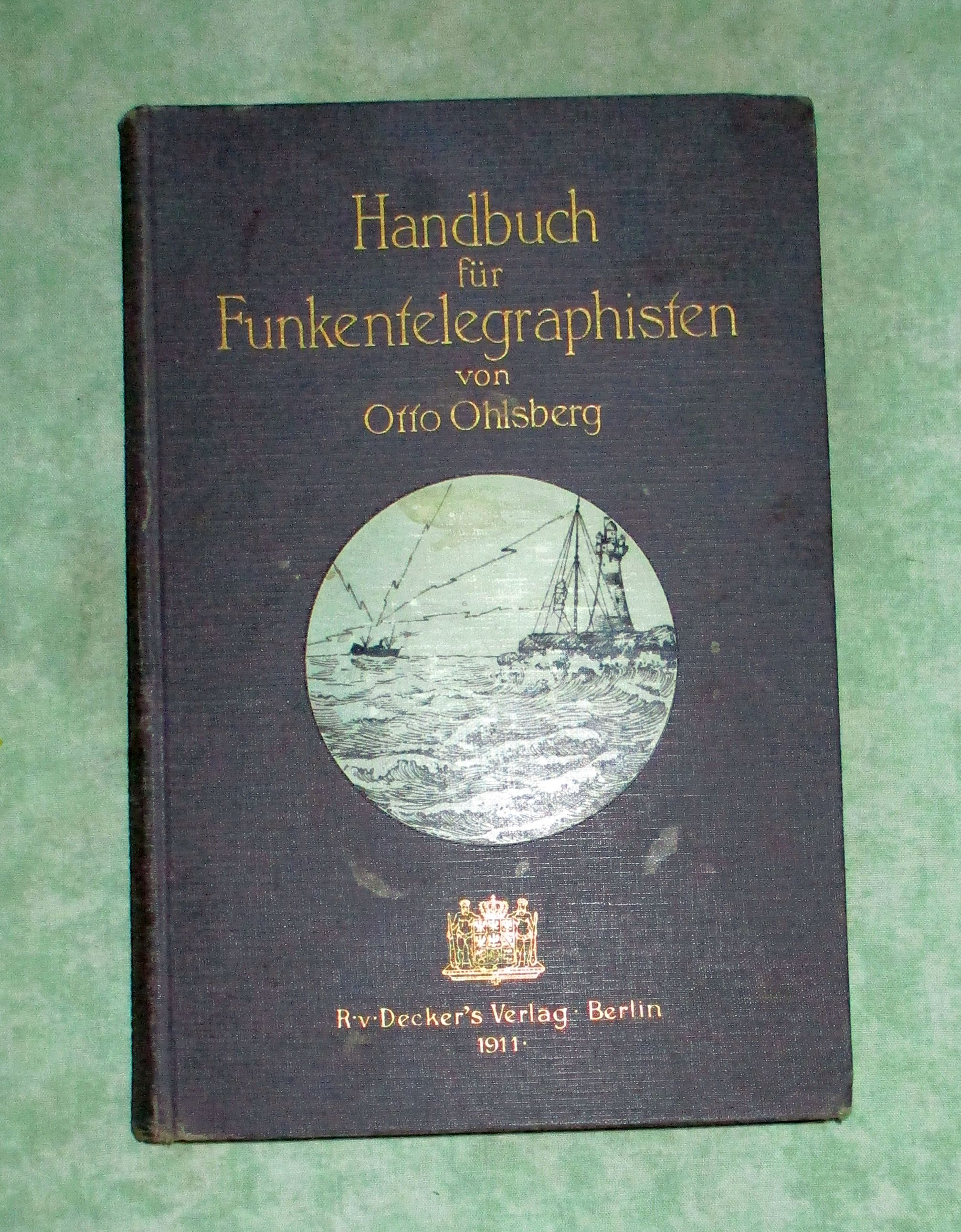 Marinegeschichte – Schiffe + Schifffahrt Ohlsberg, Otto: Handbuch für Funkentelegraphisten. Lehr- u. Übungsbuch auch f. d. Selbstunterricht. Berlin, v. Decker’s Verlag. 1911. 8 14 Beil. XVI, 224 S. Mit 41 Abb. Illustr. Originalleinen. Vorderes Gelenk geringfügig gelockert, Stempel einer Behörde am Vorsatz.. Insgesamt ein gutes, sauberes Ex. Beilage: „Weltkarte für den Funken Telegraphen Verkehr“.