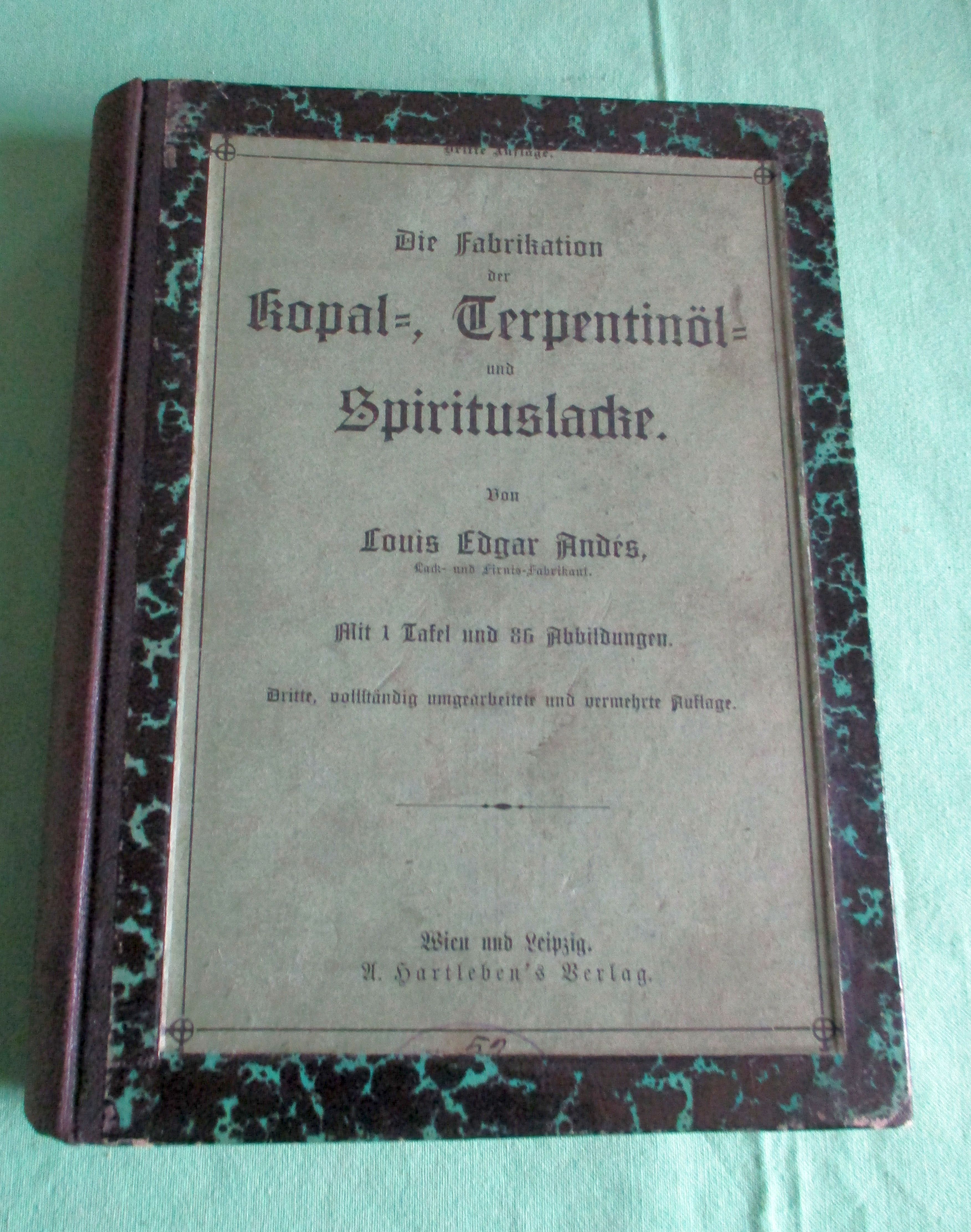 Chemische Technologie Andés, Louis Edgar. Die Fabrikation der Kopal-, Terpentinöl- und Spirituslacke. 3. vollst. umgearb. u. verm. Aufl. hrsg. von Erich Stock. Wien. A. Hartleben, 1909. 8. XVI. 488 Seiten, mit 1 Taf. u. 86 Abb. Spätere Bindung unter Einbeziehung des Originalumschlages. Ein gutes Ex.! Hartlebens chemisch-technische Bibliothek ; Bd. 102.