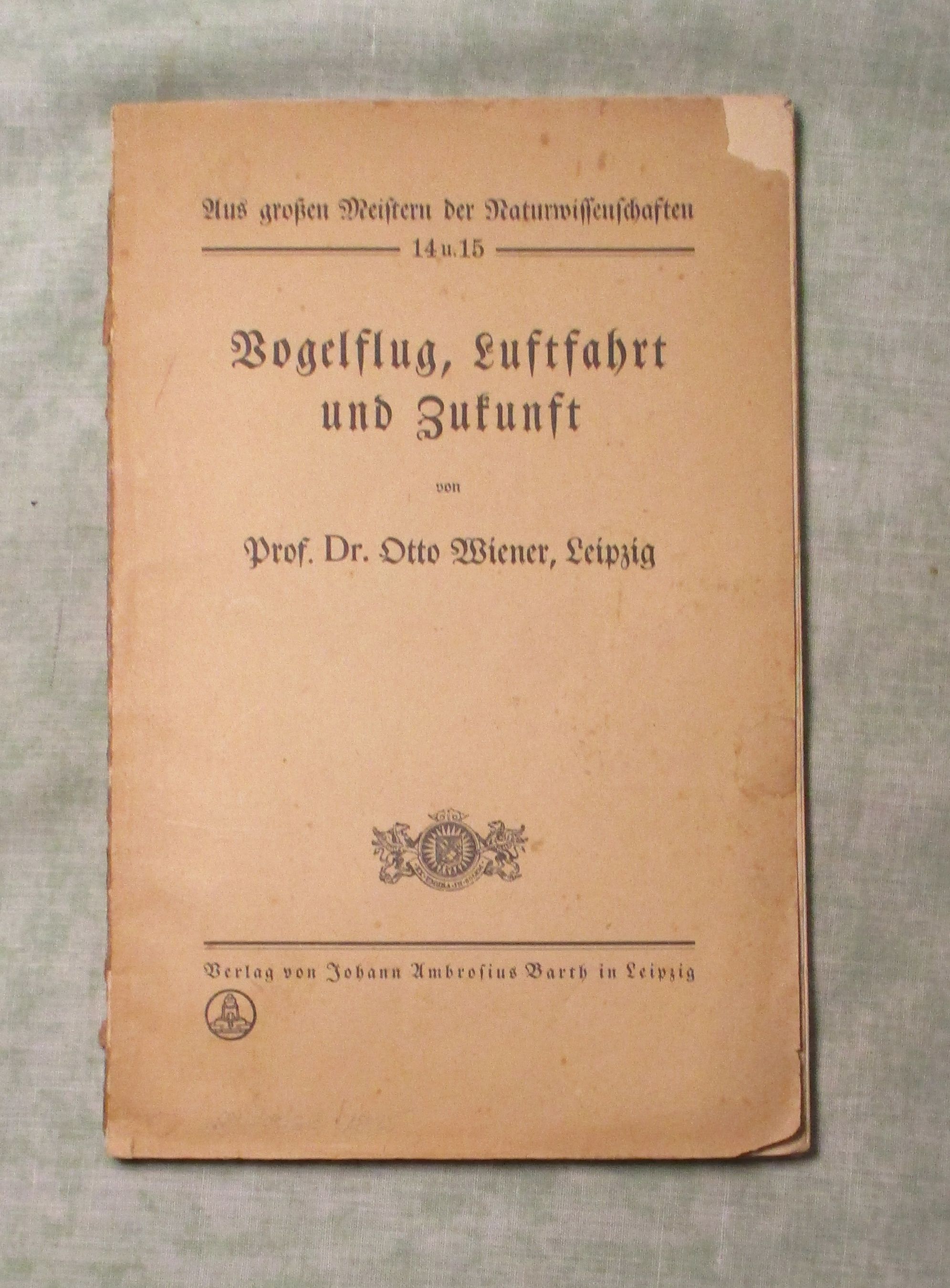 Luft- + Raumfahrt Wiener, Otto: Vogelflug, Luftfahrt und Zukunft. Leipzig. J. A. Barth. 1917. 8. 59 Seiten. brosch. Einband leicht fleckig, mit kleinem Eckabriss. Aus grossen Meistern der Naturwissenschaften, 14 u.15. Wiener weist als einer der ersten darauf hin, dass sich in größeren Höhe höhere Geschwindigkeiten erreichen lassen: „die Geschwindigkeit läßt sich ohne weiteres dadurch steigern, dass der Flieger zu grösseren Höhen aufsteigt . 11.000 m [die Reiseflughöhe heutiger Strahl-Verkehrsflugzeuge] . ist eine Höhe, in der in der sich der Mensch nur mit Hilfe von Sauerstoffatmung aufhalten könnte.“ –