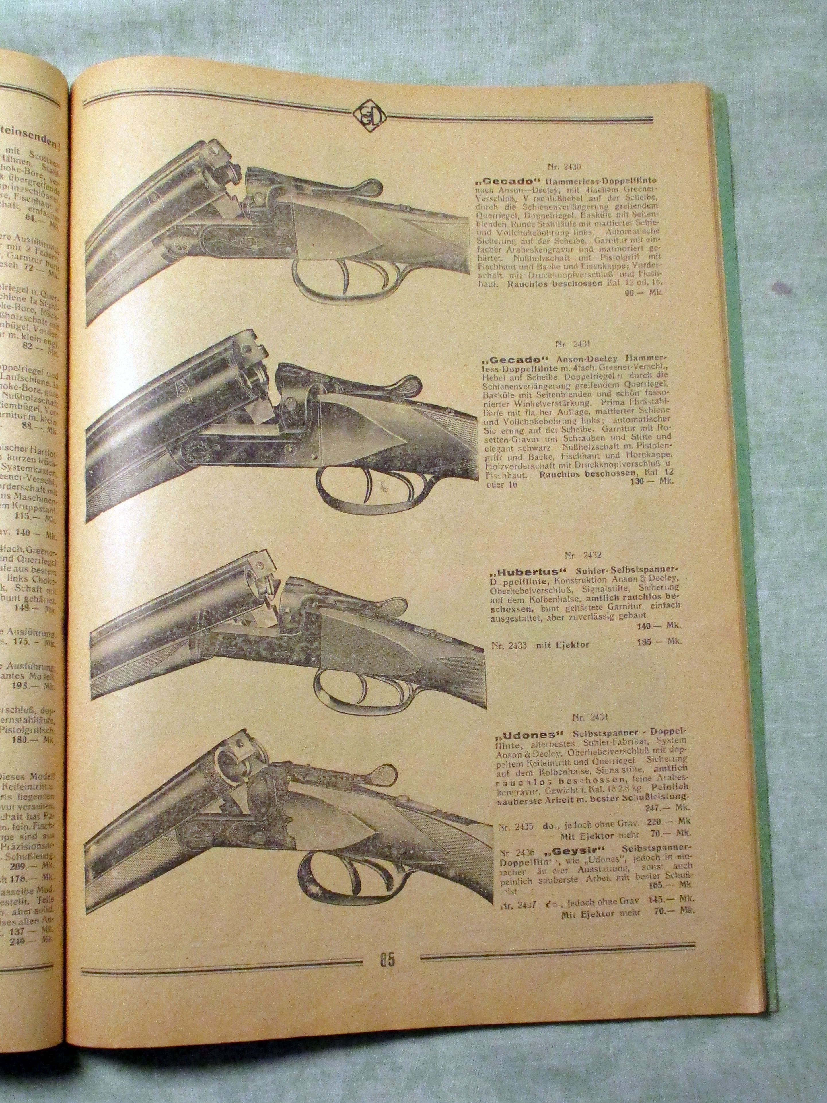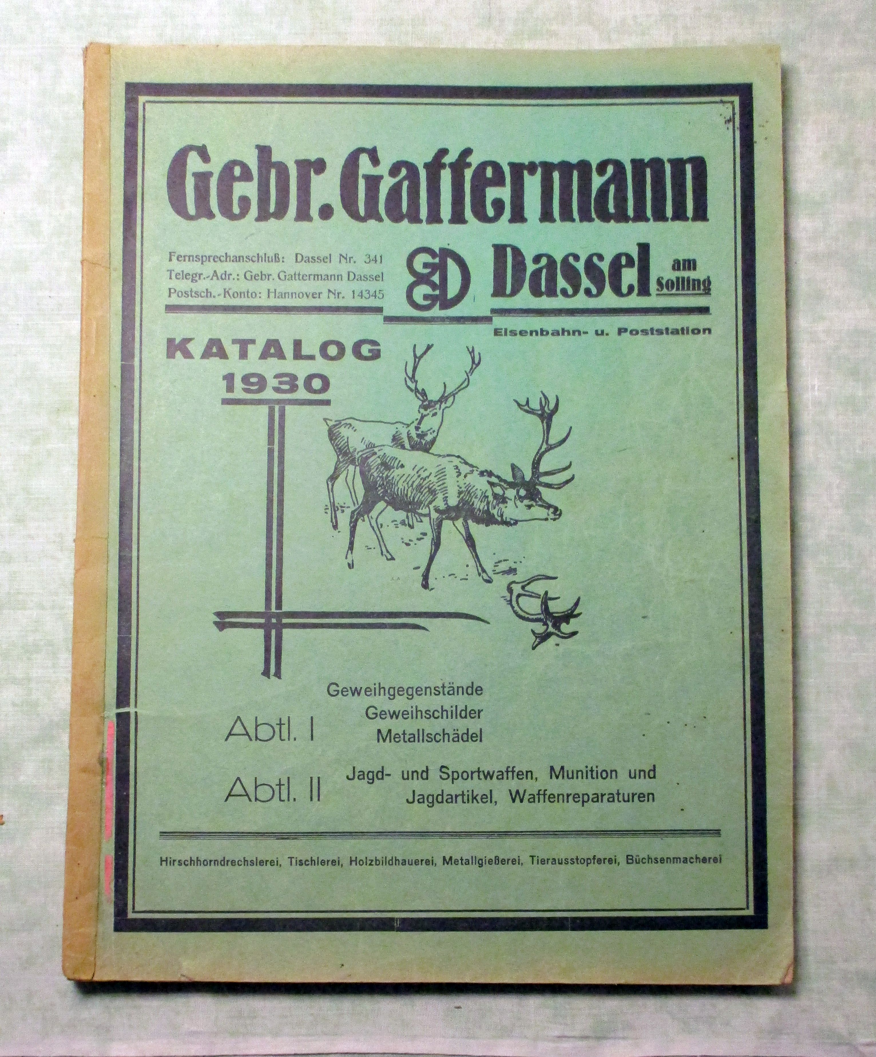 Jagd Gebr. Gattermann. Katalog von 1930. Abt. I: Geweihgegenstände – Geweihschilder – Metallschädel. Abt. II: Jagd und Sportwaffen, Munition und Jagdartikel, Waffenreparaturen. Dassel am Solling, Südhannover. 121 Seiten, durchgehend illustriert. Einband und einige Seiten leicht fleckig. Insgesamt jedoch in gutem Zustand! Neben den im Titel angeführten Pruduktbereichen alle relevanten Jagdutensilien wie Bilder mit Jagdszenen, Jagdmesser aller Art, Jagdbestecke, Pistolen und Gewehre aller Art, Rucksäcke,Jagdstöcke, Wildlocker, Patronenkoffer, Fallen, Bronzeplasiken mit jagdlichen Darstellungen usw.