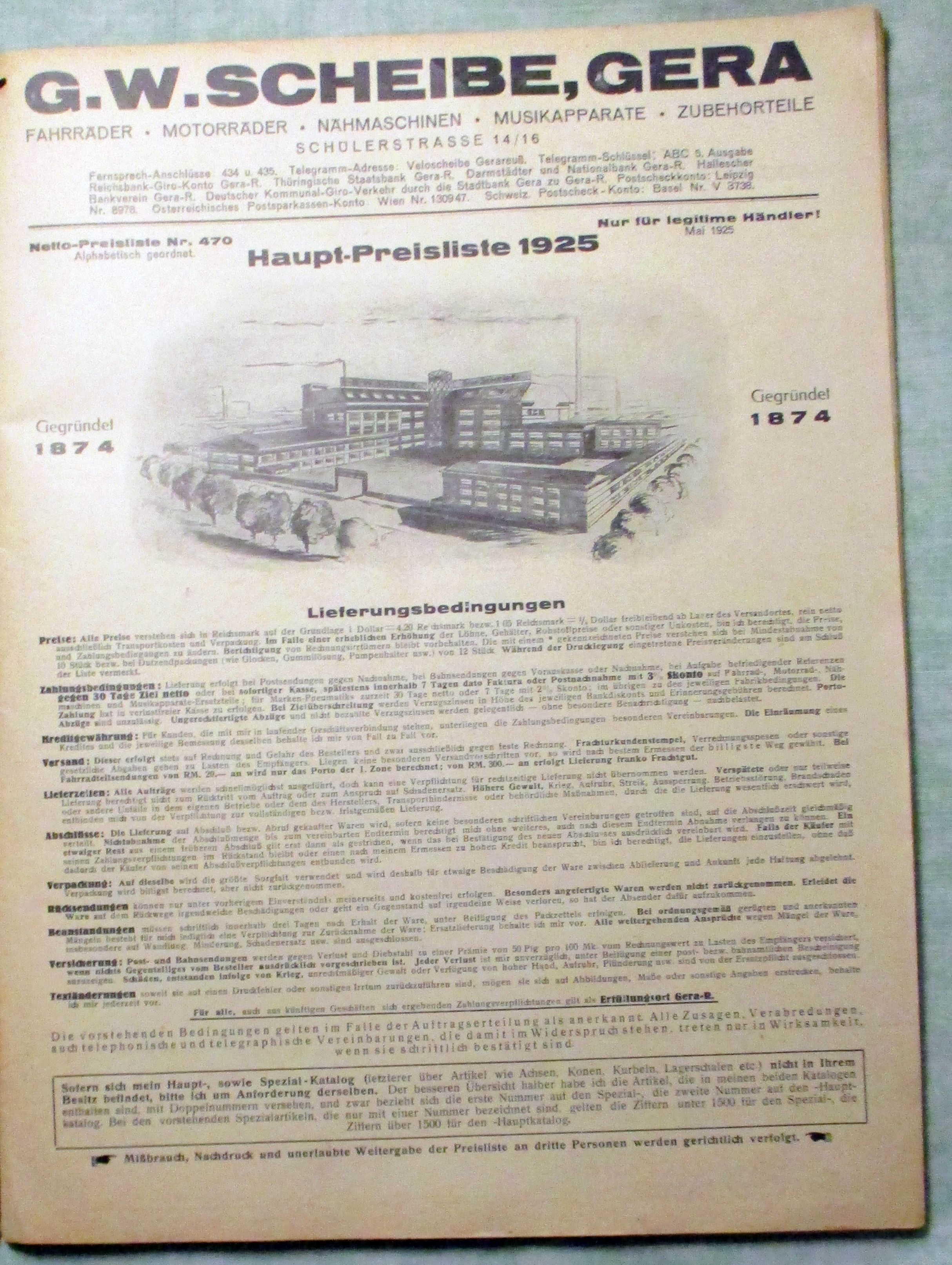 Firmengeschichte + Firmenkataloge G.W. Scheibe – Gera-R. Fahrräder – Motorräder – Pneumatiks – Nähmaschinen – Musikapparate – Schallplatten. Hauptpreisliste + Nachtrags-Preisliste 1926. 1925/26 Hauptpreisliste: 56 Seiten, Nachtragsliste 20 Seiten. 31 Abb. der Geschäftsräumlichkeiten (Büro, Lager, Werkstätten) Das Preisverzeichnis ohne Abbildungen. Einband mit Knickspuren und Randläsur. Innen einwandfrei.