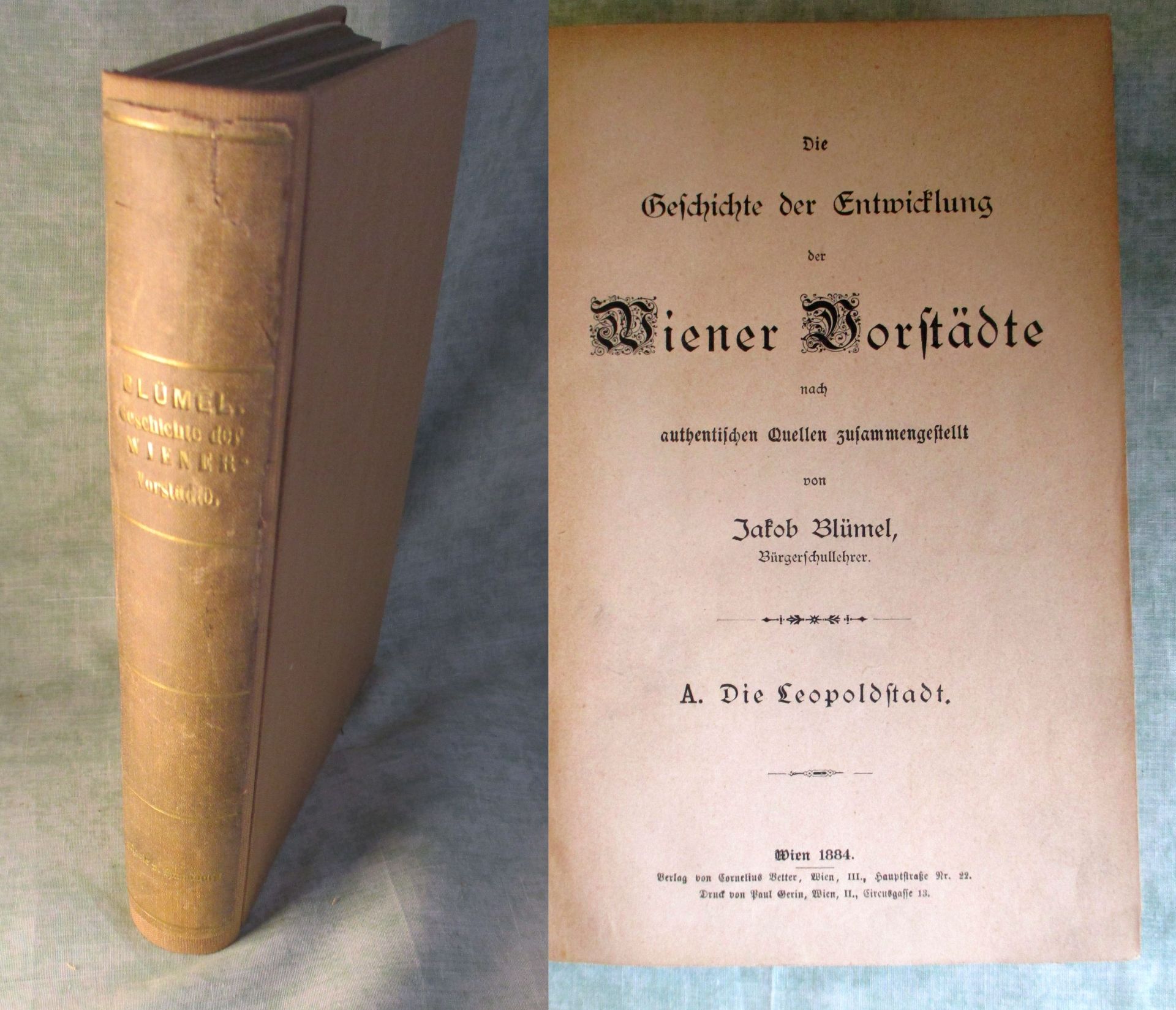 Wien – Landeskunde Blümel, Jakob. Die Geschichte der Entwicklung der Wiener Vorstädte nach authentischen Quellen zusammengestellt. A. Die Leopoldstadt. B. Die Landstraße. C. Die übrigen Vorstädte. Wien. Cornelius Vetter. 1884. A: 4 Bl. 110 Seiten, B: 2 Bl. 342 S. C: V. 231 Seiten, zahlr. Abb. Neu gebunden mit altem aufkaschiertem Rücken. Insgesamt ein gutes Ex.