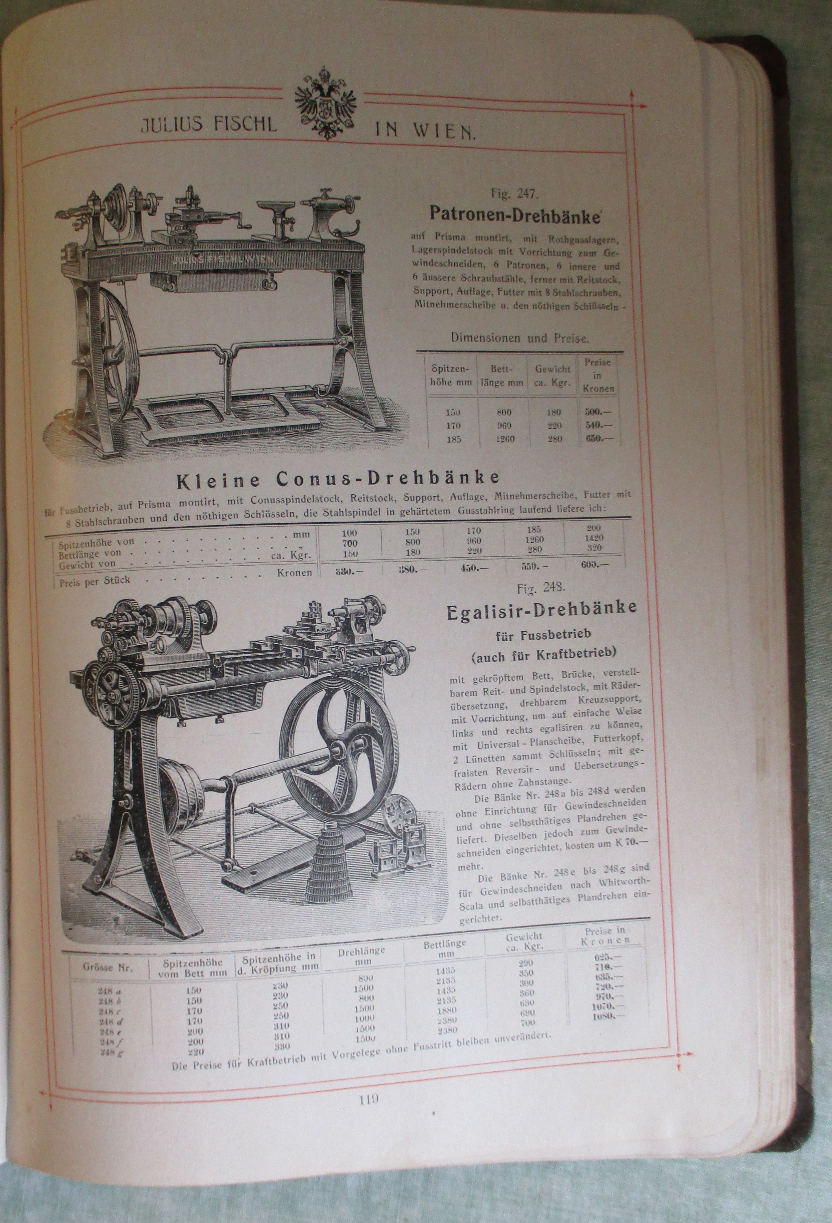 Firmengeschichte + Firmenkataloge Julius Fischl – Wien II/², Lichtenauergasse 1 – Grosshandlung in Maschinen, Techn. Bedarfsartikel für alle Industrien und Eisenbahnen. – Treibriemen-Manufactur. Neuer Illustrirter Catalog. Wien. 1902. 200 Seiten, durchgehend illustriert. Hardcover. Ecken bestossen und leicht staubfleckig. Innen einwandfrei. Maschinen, Ventile, Schmieraparate, Werkzeuge aller Art, Drehbänke, Waagen, Pumpen, Feuerspritzen, Bleche, Motore, Lampen usw.