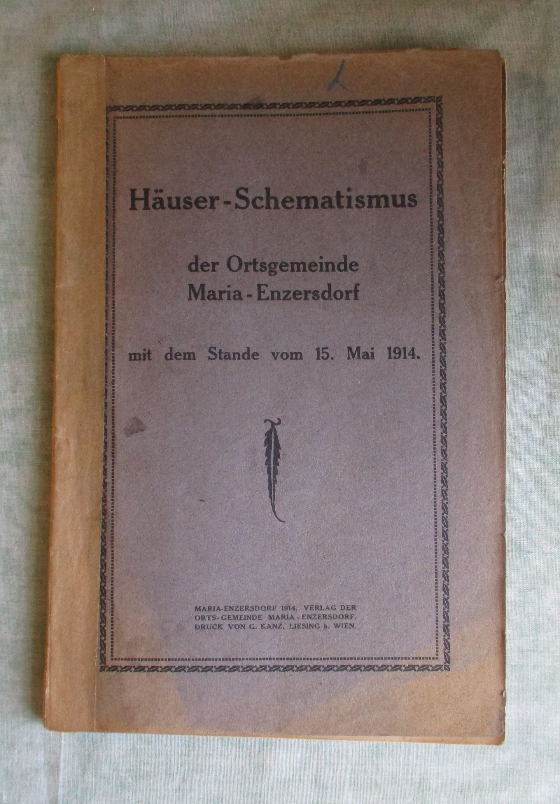Niederösterreich – Orts- und Landeskunde Häuser- Schematismus der Ortsgemeinde Maria-Enzersdorf mit dem Stande vom 15. Mai 1914. Maria-Enzersdorf. Verlag der Ortsgemeinde. 108 Seiten. kart. Ein gutes Ex. Verzeichnis der Straßen, Gassen und Plätze – Verzeichnis der Hauseigentümer in alphabetischer Reihenfolge und deren Konskriptionsnummer . Verzeichnis der Straßen, Gassen und Plätze, deren Orientierungs- und Konskriptionsnummern.