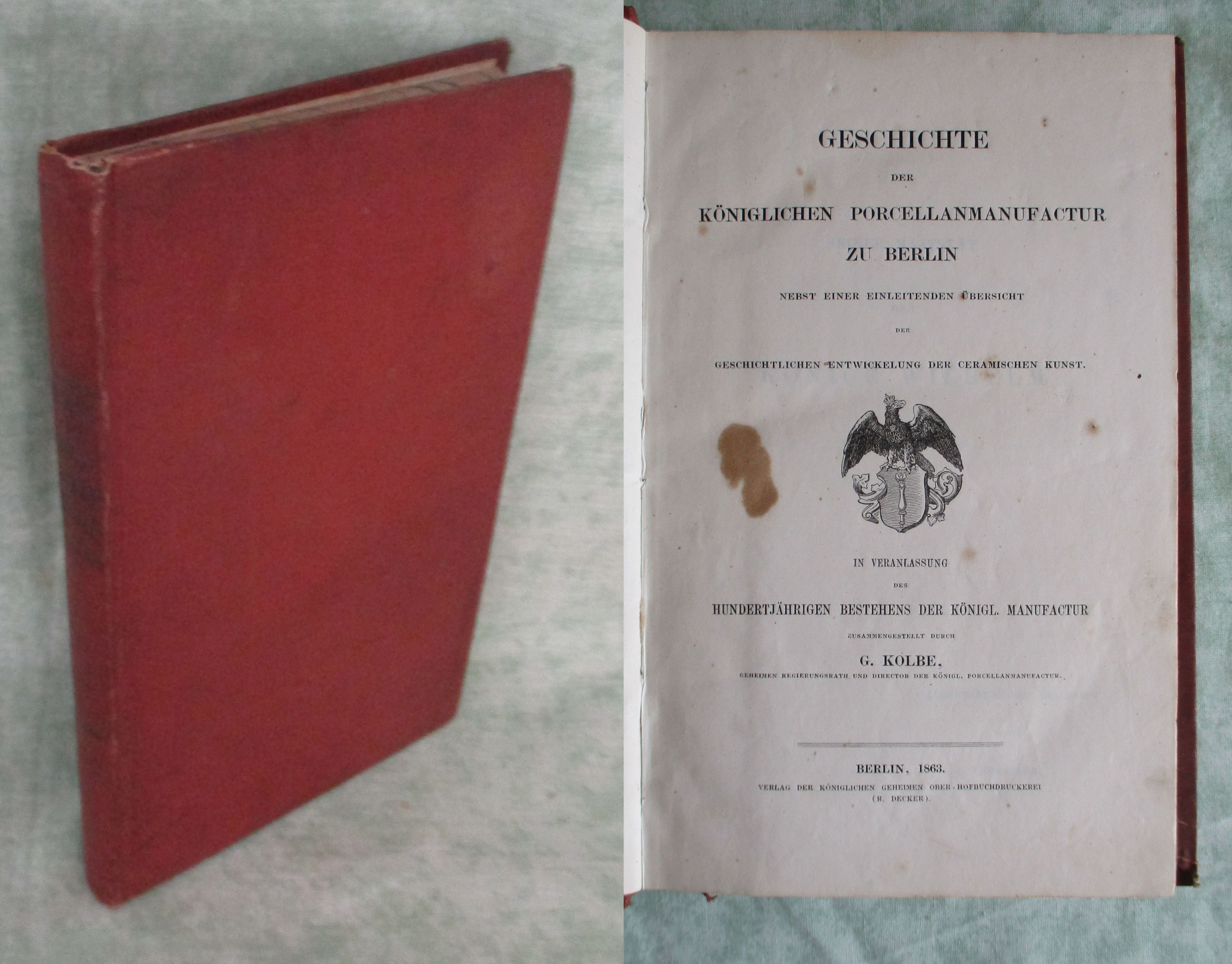 Kunsthandwerk + Kunstgewerbe Kolbe, G. Geschichte der königlichen Porcellanmanufaktur zu Berlin Nebst einer einleitenden Übersicht der geschichtlichen Entwicklung der ceramischen Kunst. Berlin. Vlg. der königlichen geheimen Ober-Hofbuchdruckerei. 1863. VIII. 299 Seiten, Leinen mit goldgepr. Rücken. leicht gebräunt, teils stockfleckig, Eigentumsvermerk auf dem Vorsatz, Gebrauchsspuren .
