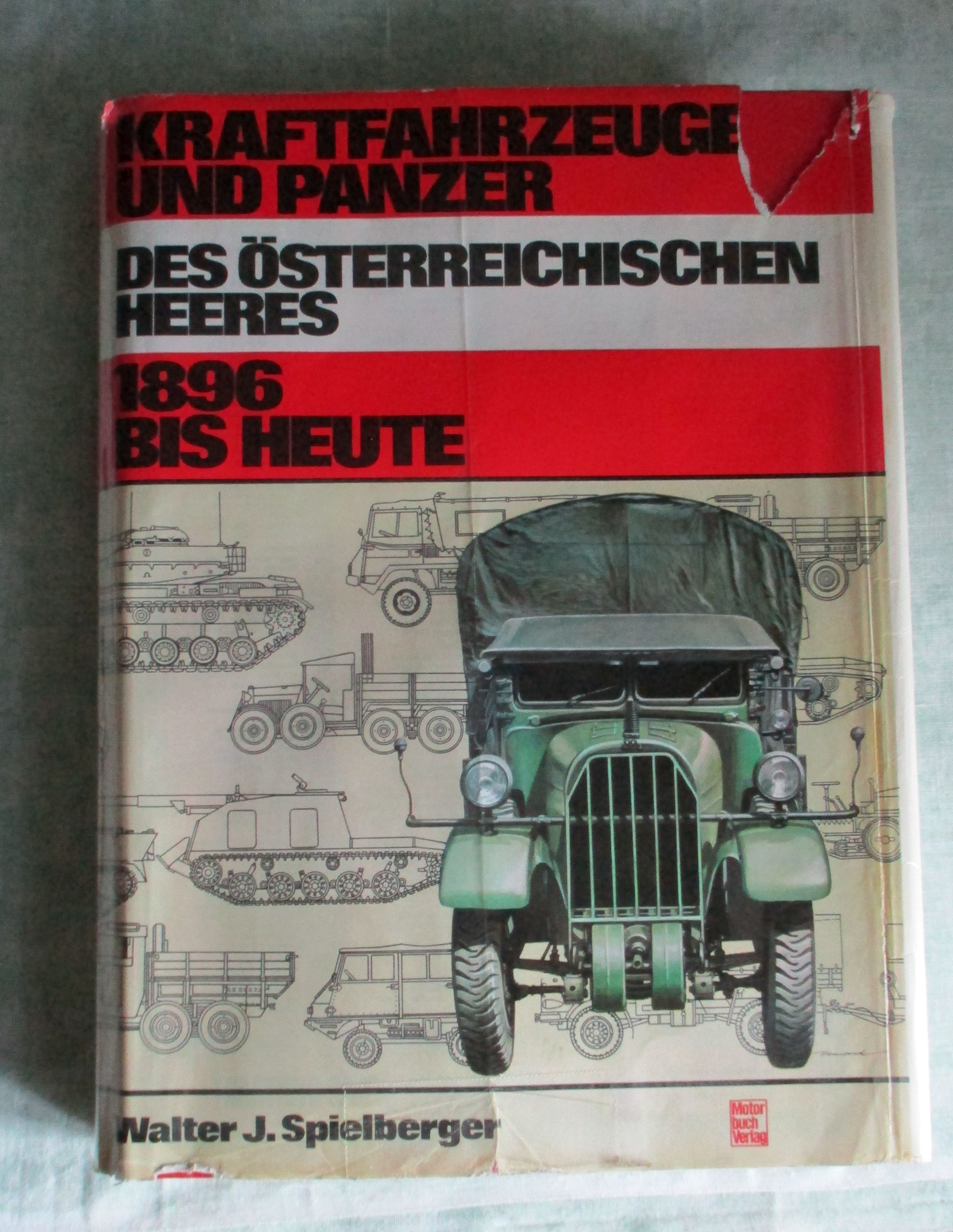 Österr. Heeres- + Marinegeschichte Spielberger, Walter J.: Kraftfahrzeuge und Panzer des österreichischen Heeres. 1896 bis heute. 1. Aufl. Stuttgart, Motorbuch-Verlag, 1976. 25 cm. 534 Seiten, durchgehend illustriert. Schutzumschlag stark beschädigt, ansonsten in gutem, sauberem Zustand.
