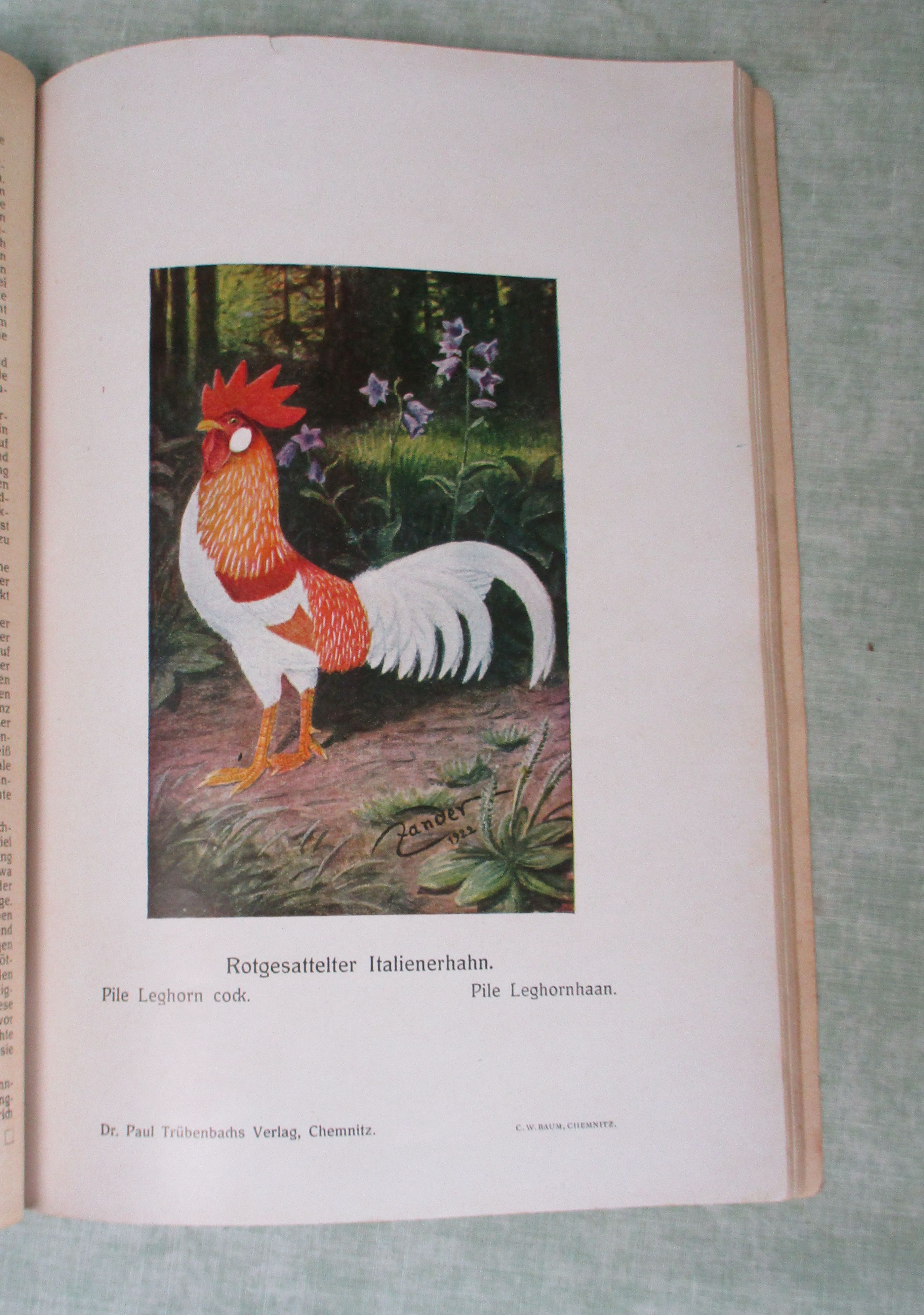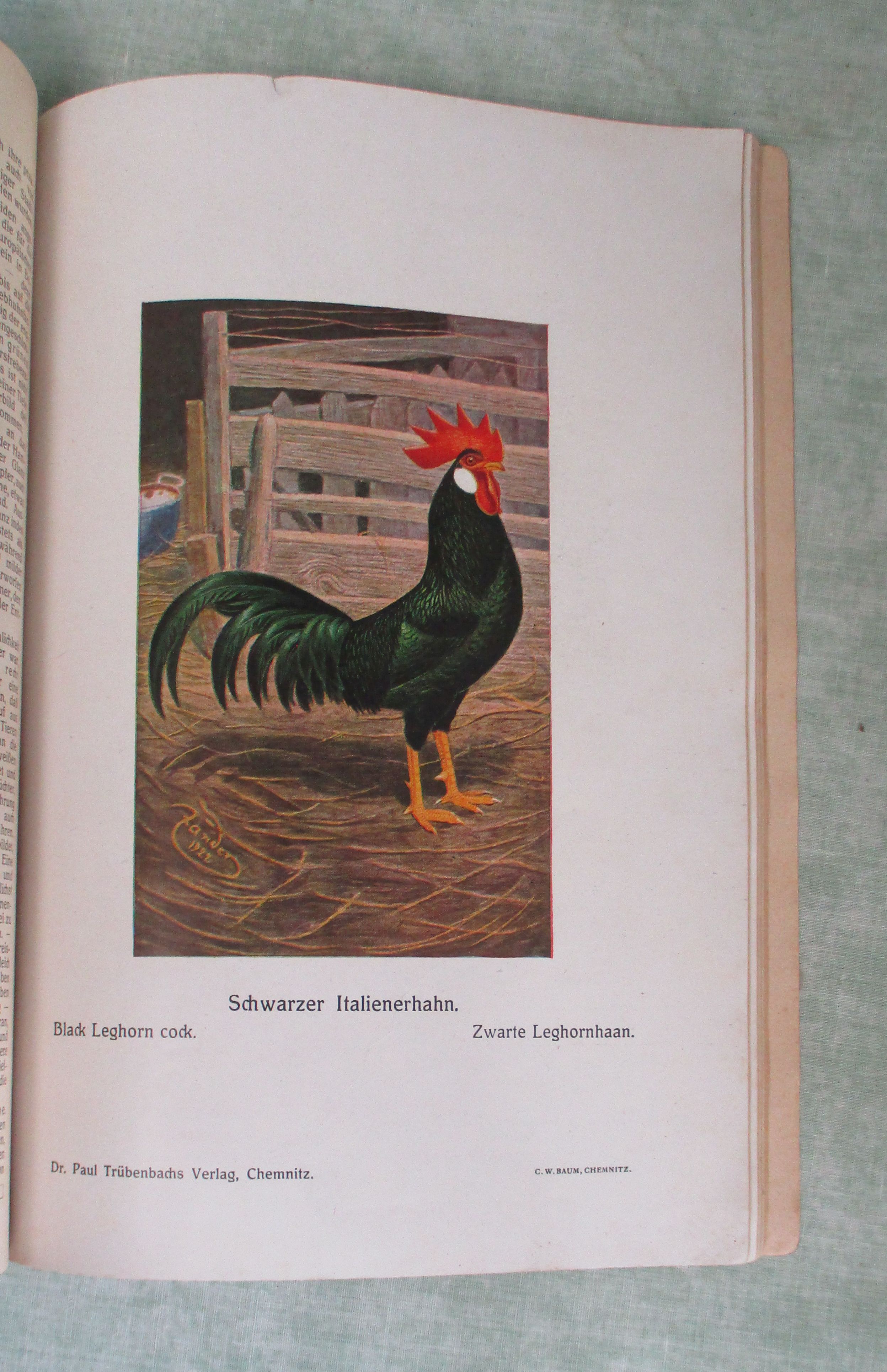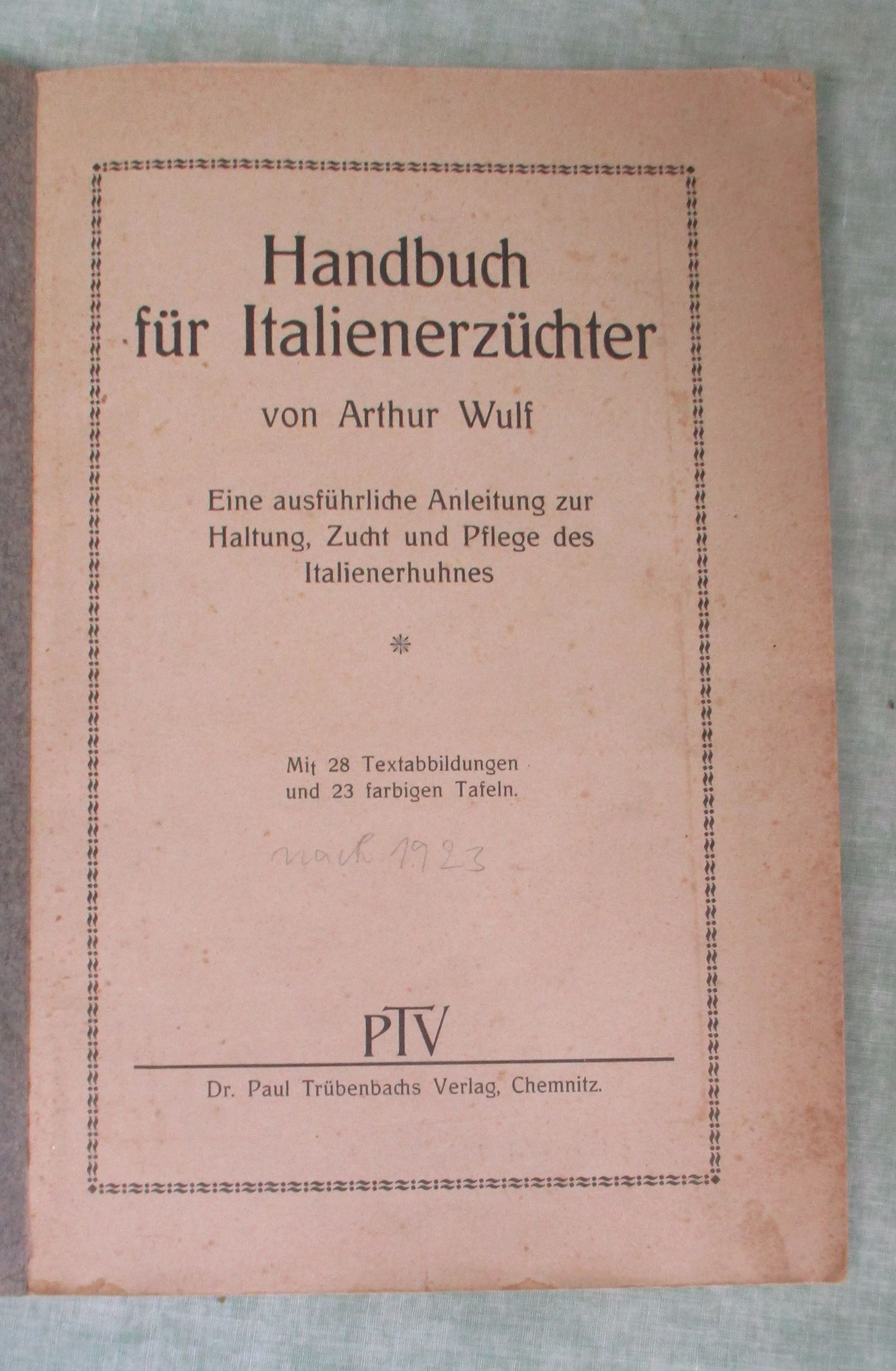 Stubenvögel-, Geflügel-, und Taubenliteratur Wulf, Arthur. Handbuch für Italienerzüchter. Eine ausführliche Anleitung zur Haltung, Zucht und Pflege des Italienerhuhns. Chemnitz. Dr. Paul Trübenbachs Verlag. 109 Seiten, 28 Textabbildungen, 23 farbige Tafeln. kart. Einband mit kleinem Eckabriss. (siehe Bilder)