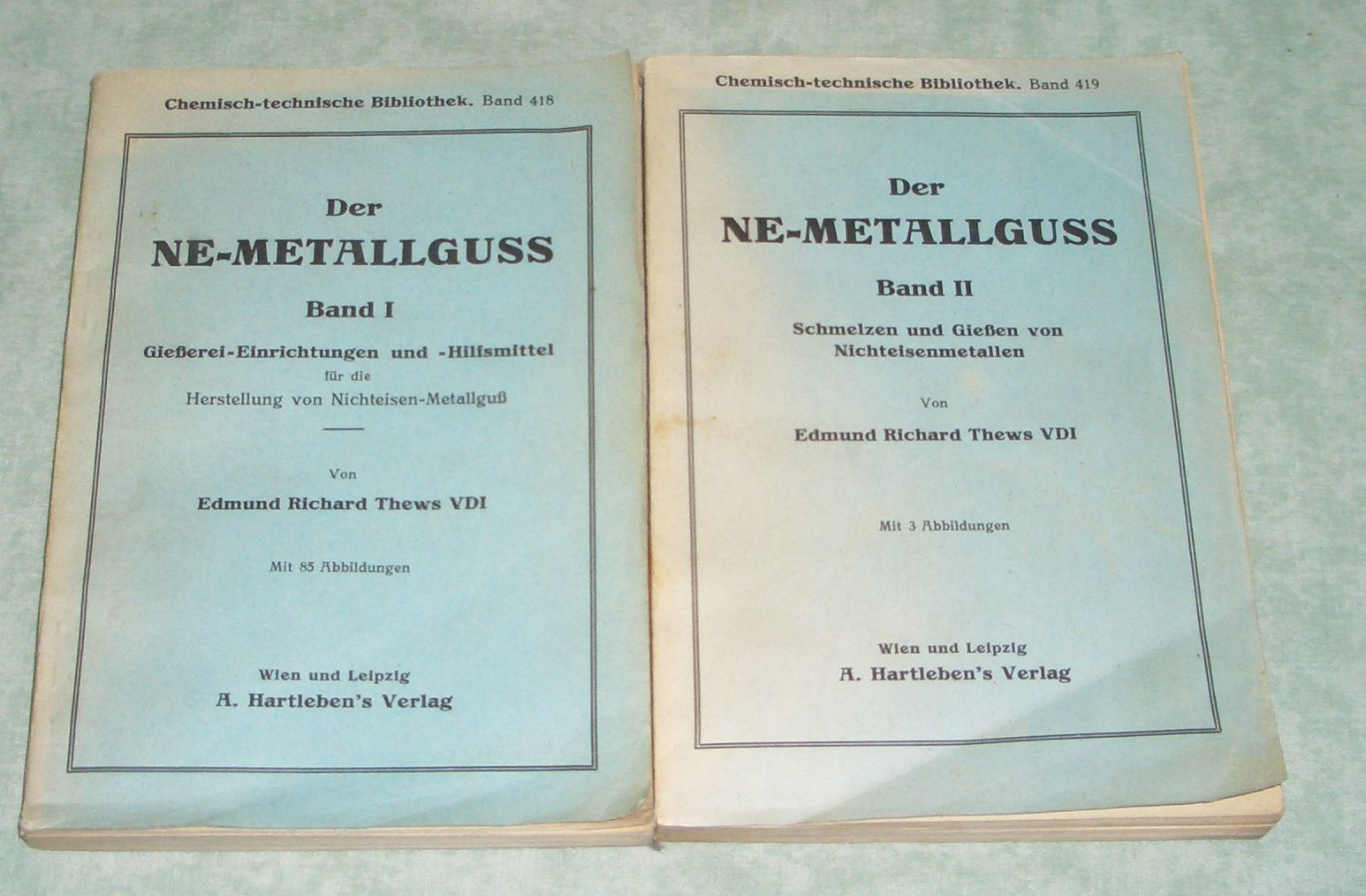 Technik + Technikgeschichte Thews, E. R. Der NE-Metallguß. Band I: Gießerei-Einrichtungen und -Hilfsmittel für die Herstellung von Nichteisen-Metallguß. Band II: Schmelzen und Gießen von Nichteisenmetallen. 2 Bde. Wien und Leipzig. Hartleben. 12,5x18. V. III. 215. 235 Seiten. 88 Abb. Brosch. Chemisch-technische Bibliothek 418/419.