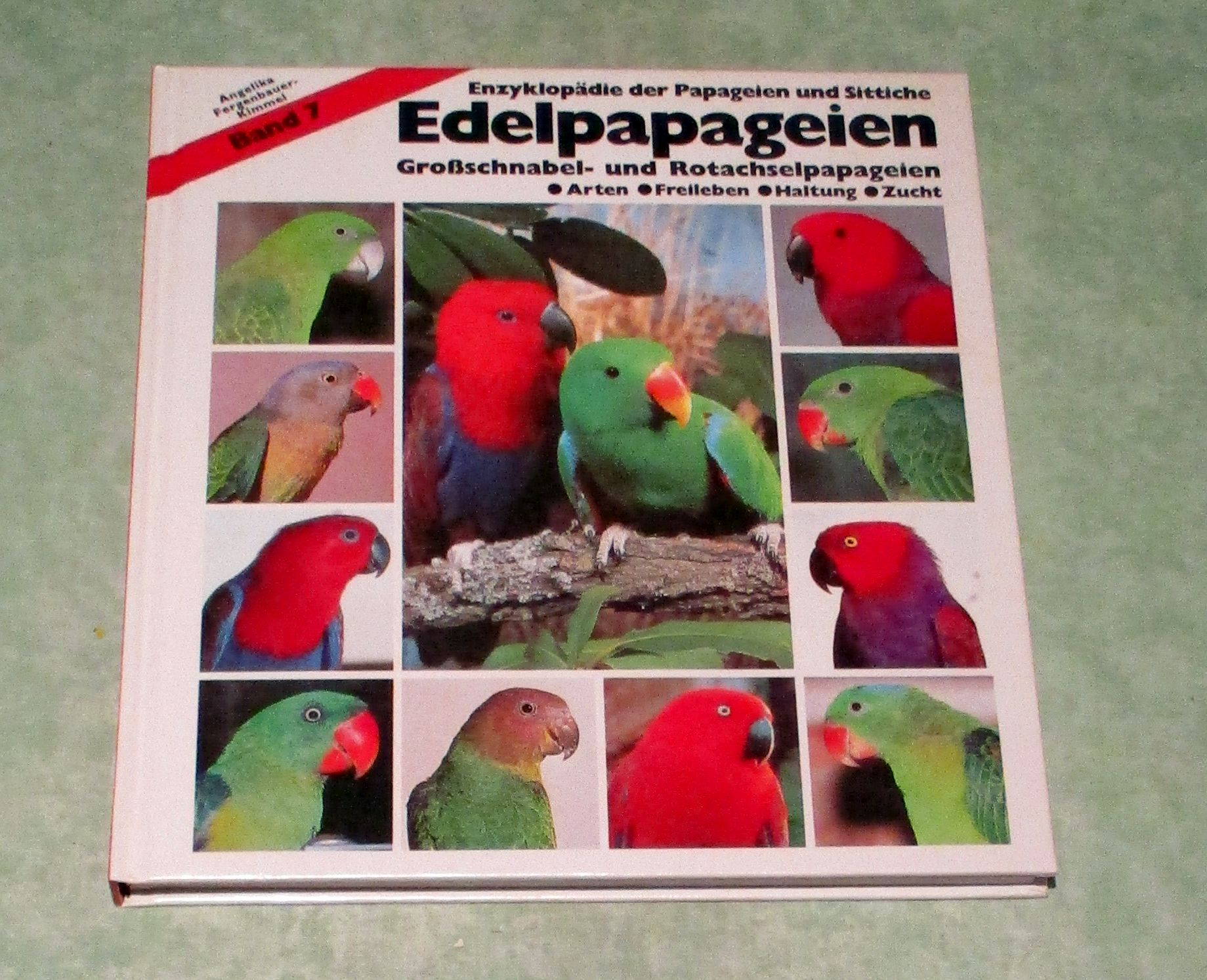 Stubenvögel-, Geflügel-, und Taubenliteratur Fergenbauer-Kimmel, A. Edelpapageien. Großschnabel- und Rotachselpapageien. Arten – Freileben – Haltung – Zucht. Walsrode. Müller. 1992. 121 Seiten. Mit zahlreichen Farbfotos illustriert. Fest gebunden. Enzyklopädie der Papageien und Sittiche. Bd. 7.