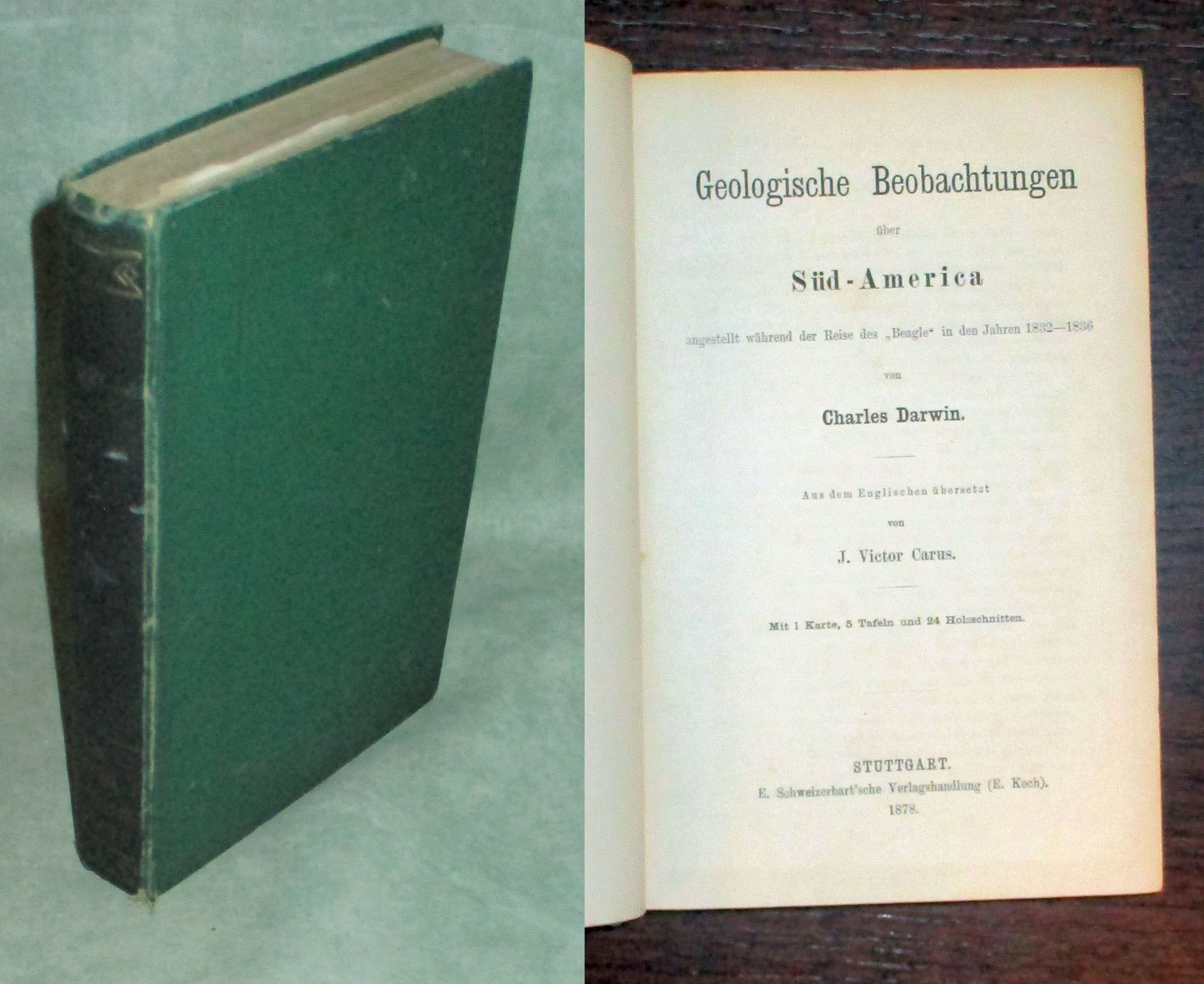 Geowissenschaften – Paläontologie Darwin, Charles. Geologische Beobachtungen über Süd-America angestellt während der Reise der „Beagle“ in den Jahren 1832-1836. (!. Abtheilung) Kleinere geologische Abhandlunge (Zweite Abtheilung). Zweite Gesammt-Ausgabe. Stuttgart. Schweizerbart. 1878. Gr. -8°. X.400.104 Seiten, 2 Karten, 5 Tafeln, 38 Holzschnitte. Blindgepr. grüner Leinenband. Einband leicht berieben und bestoßen, einige Seiten leicht stockfleckig, aber durchaus noch gutes Ex. Ch. Darwin’s gesammelte Werke. Zwölfter Band. Erste und zweite Abtheilung.