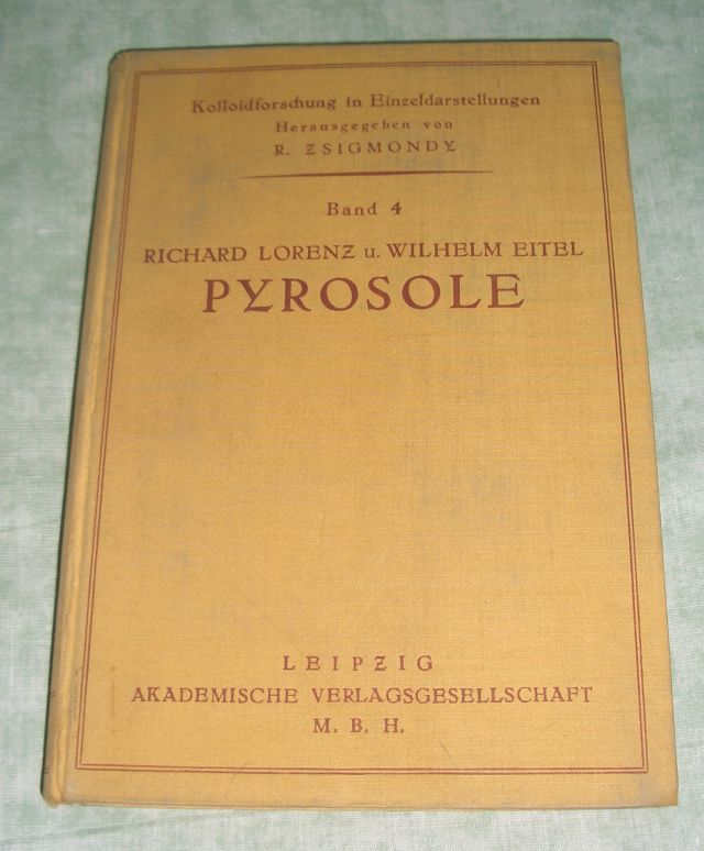 Chemische Technologie Lorenz, Richard; Eitel, Wilhelm: Pyrosole. Das kolloide Phänomen in der glühend flüssigen Materie und seine Erstarrungs-Zustände unter Berücksichtigung des latenten photographischen Bildes. Leipzig, Akadem. Verlagsgesellschaft. 1926. 8. IX, 290 S., Mit 64 Fig. im Text u. 20 Taf. Originalleinen. Einband staubfleckig. Exlibris und Stempel der Kekulé-Bibliothek der Farbenwerke Bayer am Innendeckel und Titel. Innen ohne spezifische Gebrauchsspuren. Gutes Ex. Kolloidforschung in Einzeldarstellungen ; Bd. 4.