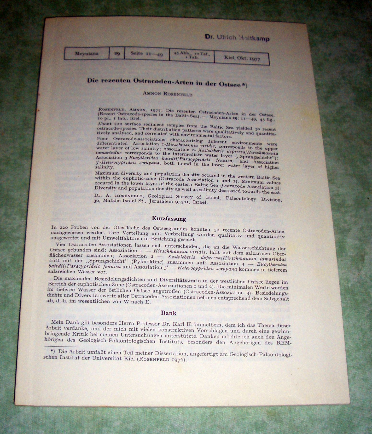 Meeresbiologie + Limnologie + Hydrobiologie Rosenfeld, Amnon. Die rezenten Ostracoden-Arten in der Ostssee. Kiel. 1977. S. 11 – 49, 49 Abb., 10 Tafeln, 1 Tabelle. Sonderdruck aus Meyniana 29.