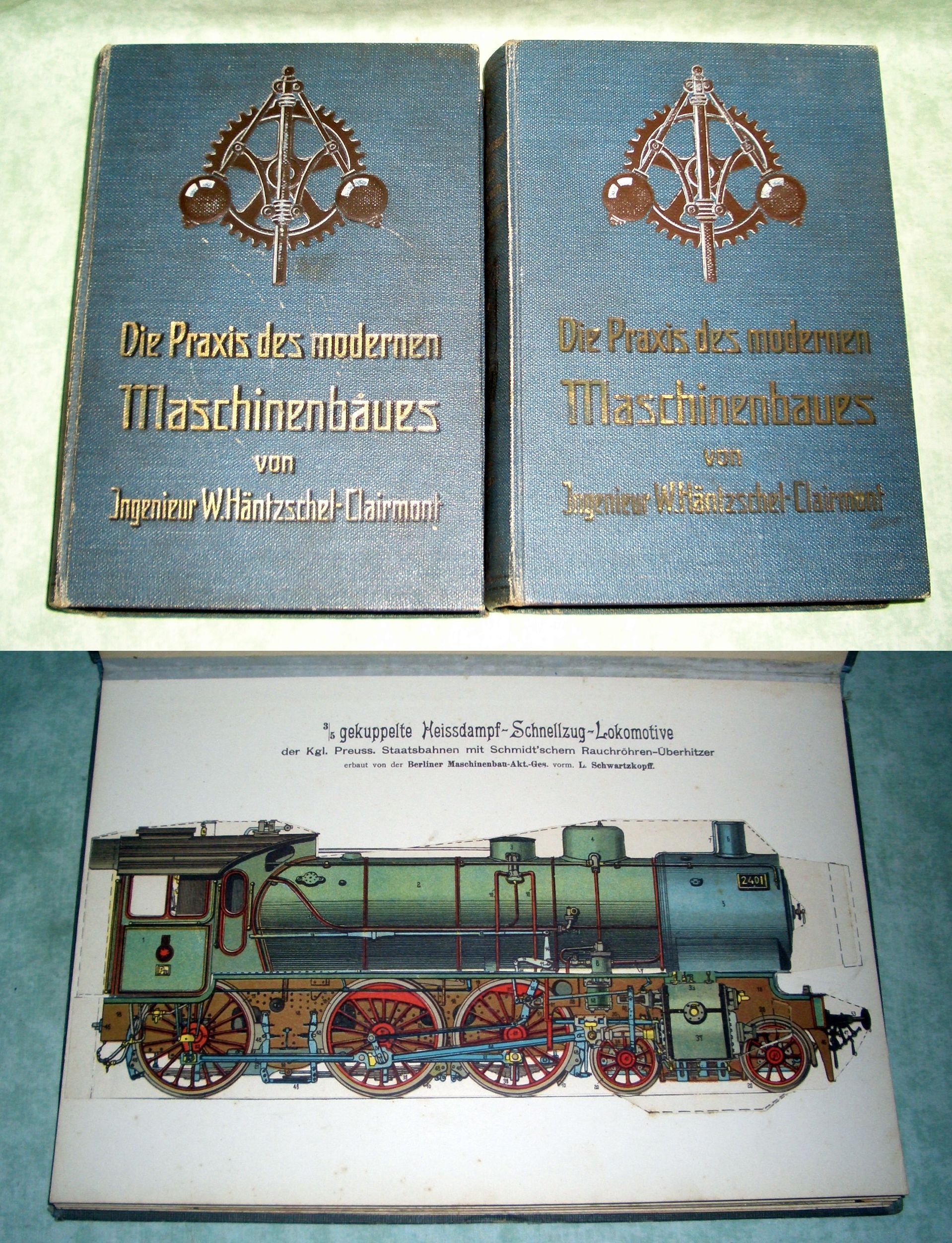 Maschinenbau Häntzschel, Walter. Die Praxis des modernen Maschinenbaues. Gemeinverständliche Darstellung der technischen Grundlagen und Praktiken des Maschinenbaues. 6. Auflage. 2 Bände + Modell-Atlas (Mit 10 zerlegbaren Maschinenmodellen auf 8 Tafeln). Berlin. Weller. 1913. XVI. 804. VIII. 892 Seiten, 22 Konstruktionstafeln, 1415 Textabb. Originalleinen. Einbände berieben, Band 2 mit Kratzspuren am hinteren Buchdeckel. Modellatlas leicht stock- und staubfleckig. Bindungen fest, Textteile flecken- und anstreichungsfrei. Mit dem (zumeist fehlenden) Modellatlas. Darin folgende Modelle: Fiat-Autombil; 3/5 gekuppelte Heissdampf-Schnellzug-Lokomotive der Königlich Preußischen Staatsbahnen; Aeroplan der Brüder Wright; kombinierte Säge-, Hobel-, Stemm- und Bohrmaschine; Dampf-Turbine System Brown Boveri Parson; Lokomobil der Firma Heinrich Lanz; Babcock & Wilcox’ Patent-Wasserrohr-Dampfkessel; 70pferdiger Diesel-Motor der Vereinigten Maschinenfabrik Augsburg Maschinenbaugesellschaft Nürnberg.