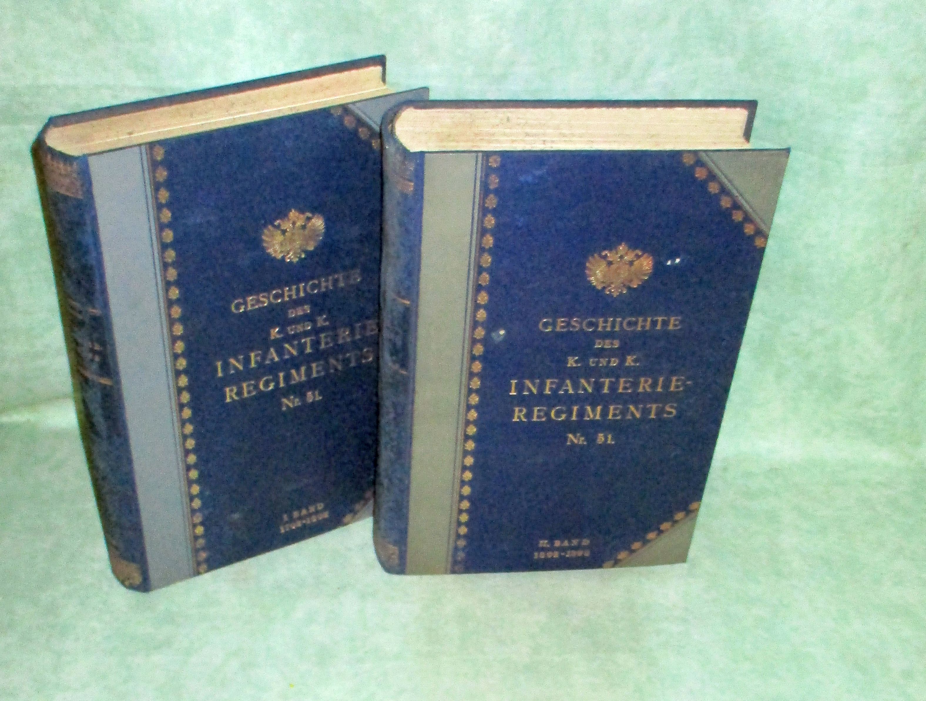Österr. Heeres- + Marinegeschichte Maendl, Maximilian: Geschichte des K. und K. Infanterie-Regiments Nr. 51. I. Band (1702-1802) 2. Band (1802-1896) Im Auftrage d. Regiments-Commandos nach authentischen Quellen bearbeitet. 2 Bände. Klausenburg. Im Verlag des Regiments. 1897. VI. 640. VI. 815 Seiten, 24 (10 farblithogr.) Tafeln. Goldgepr. Originalleinen. Rücken etwas berieben, ansonsten in sehr gutem Zustand, Außerordentlich selten!