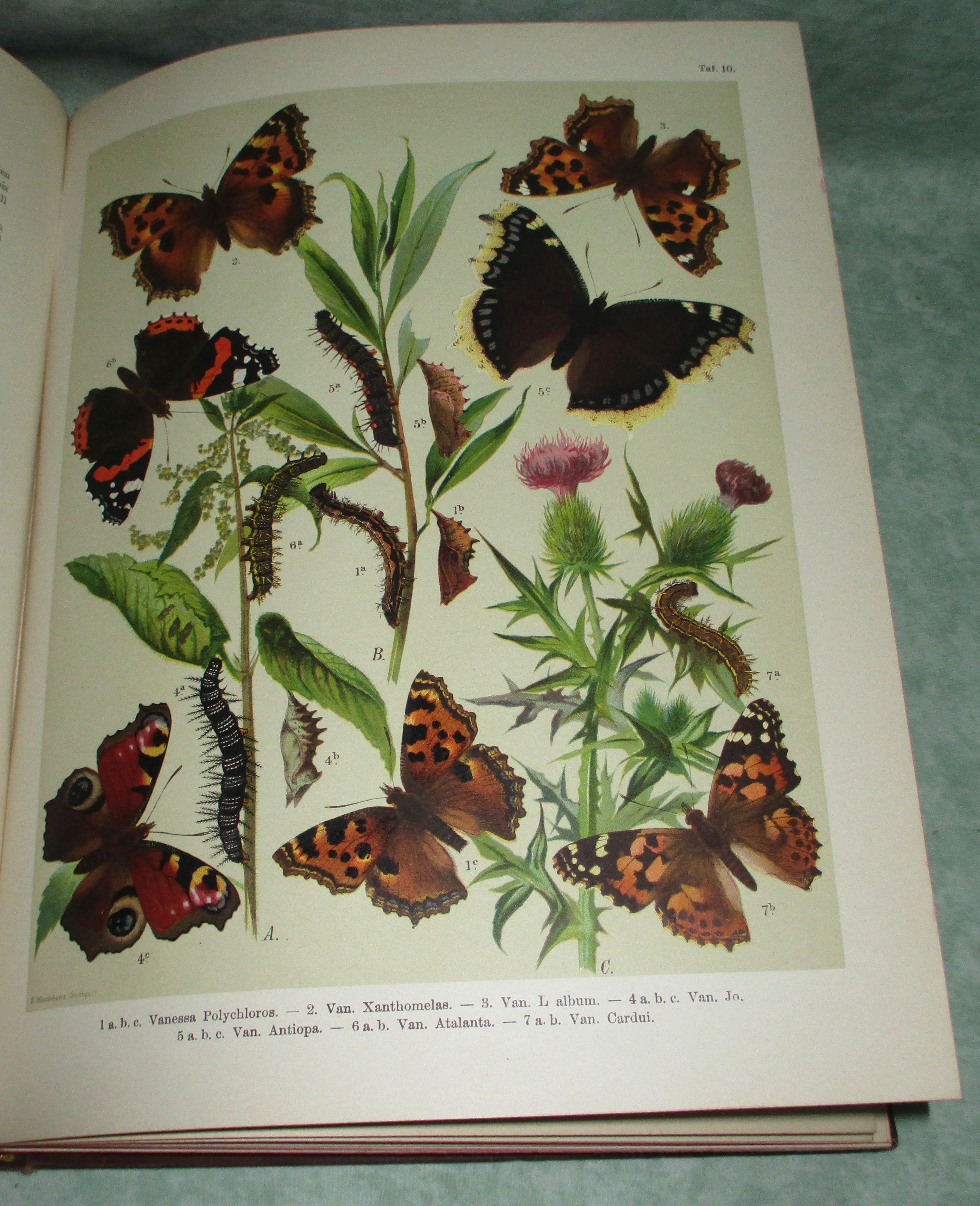 Lepidoptera – Schmetterlinge Fr. Berge’s Schmetterlingsbuch. Bearbeitet von H. von Heinemann. Durchgesehen und ergänzt von Dr. W. Steudel und Dr. Julius Hooffmann. Achte Auflage. Stuttgart. Verlag für Naturkunde. 1899. LXII. 248 Seiten, 50 (49 chromlithogr.) Tafeln mit 1500 Abb. Origianleinen. Ein ausgezeichnetes Ex. Bis auf kleine Bestossungen und einem Vorbesitzerstempel ein sehr gutes Ex.