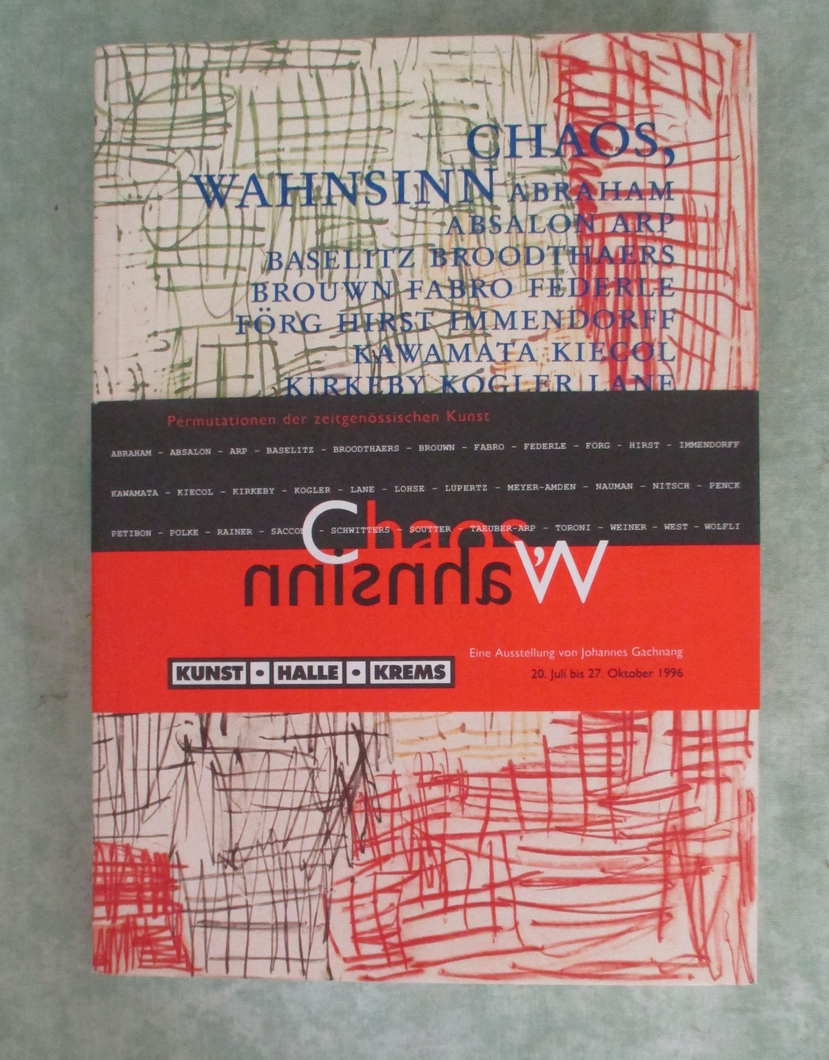 Varia Chaos, Wahnsinn. Permutationen der zeitgenössischen Kunst. Die vorLiegende Publikation erschien zur gleichnamigen Ausstellung in der Kunsthalle Krems 20. Juli – 27. Oktober 1996. Basel/Frankfurt am Main, Stroemfeld. 1996. 24 cm. 196 S. Ill. Kart. mit Banderole. . Beiträge von Wolfgang Denk, Ewa Hess, Ellen Harlizius-Klück, Eva Meyer, Konrad Tobler, Julia Kristeva, Walter Seitter, Rudolf Schmitz, Luciano Fabro, Markus Grob