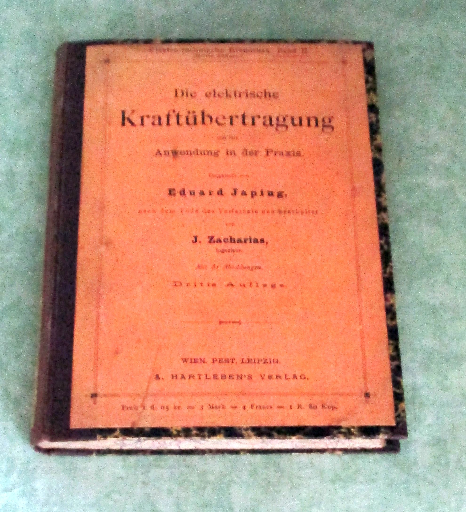 Elektrotechnik Japing, Eduard: Die elektrische Kraftübertragung und ihre Anwendung in der Praxis. 3. Aufl. Wien. Hartleben. 1891. XIV, 232 Seiten, 61 Abb. Halbleinen derZeit mit aufkaschiertem Originaleinband. Einband leicht fleckig, Vorbesitzername am Titel, ansonsten flecken- und anstreichungsfrei. Elektro-technische Bibliothek, 2.