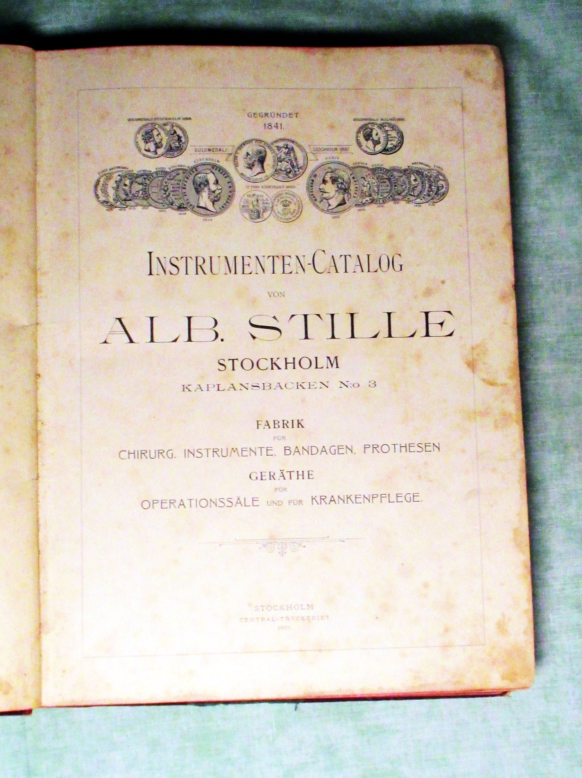 Firmengeschichte + Firmenkataloge Albert Stille – Stockholm – Kaplansbacken N° 3 – Fabrik für chirurg. Instrumente, Bandagen, Prothesen – Geräthe für Operationssäle und für Krankenpflege. Instrumenten-Catalog. Stockholm. 1901. 415 Seiten, durchgehend illustriert. Einband fleckig mit leichter Knickfalte. Innen zumeist sauber, auf einigen Seiten an den Rändern fingerfleckig. Stille wurde 1841 von Albert Stille gegründet, der eine Werkstatt zur Herstellung chirurgischer Instrumente am Karolinska-Institut in Stockholm leitete. Das Institut befand sich zu dieser Zeit im Serafimer-Krankenhaus in Kungsholm.