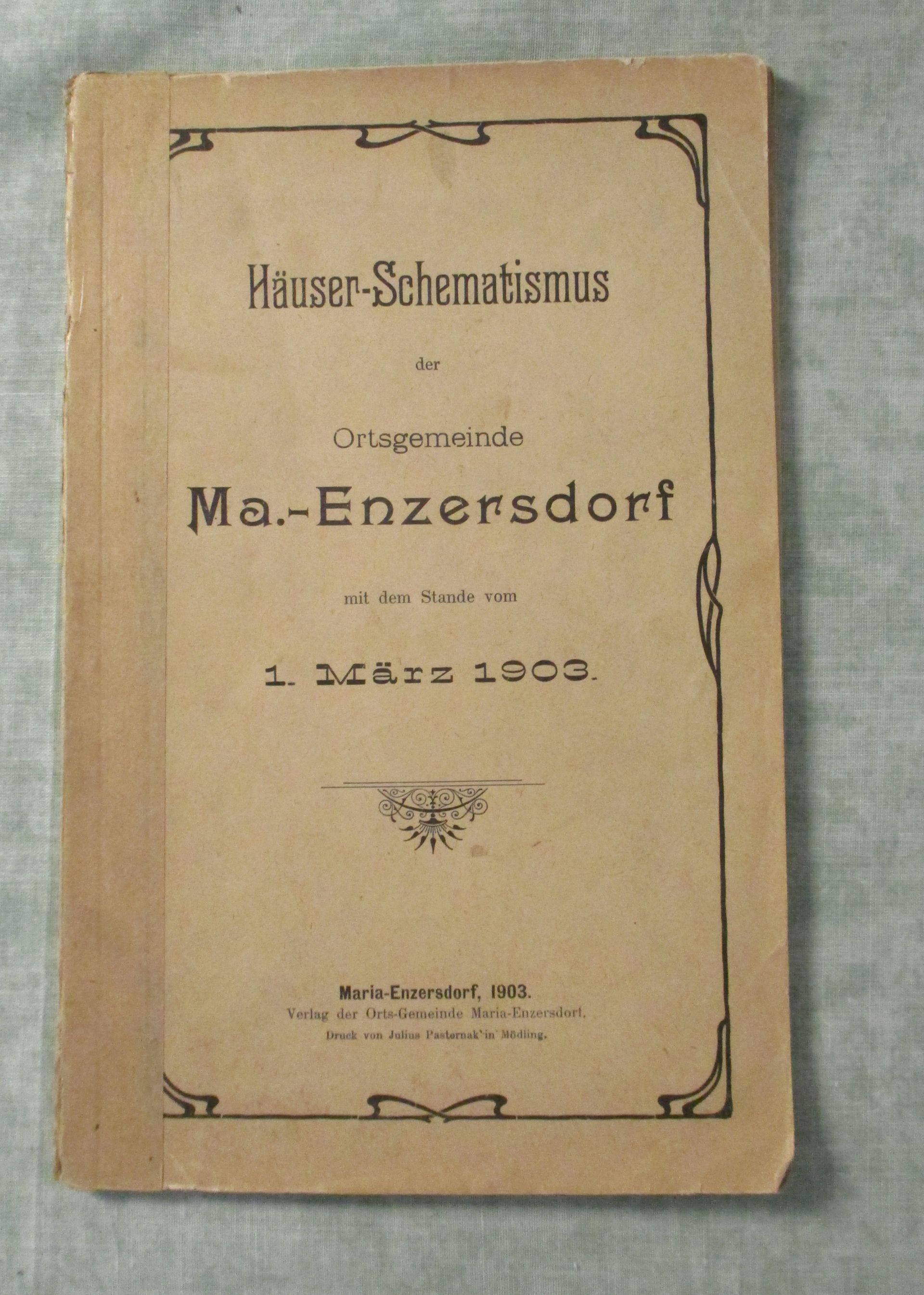 Niederösterreich – Orts- und Landeskunde Häuser- Schematismus der Ortsgemeinde Maria-Enzersdorf mit dem Stande vom 1. März 1903. 64 Seiten. kart. Rückwärtige Einbandecke mit Randläsuren. Verzeichnis der Straßen, Gassen und Plätze – Verzeichnis der Hauseigentümer in alphabetischer Reihenfolge und deren Konskriptionsnummer . Verzeichnis der Straßen, Gassen und Plätze, deren Orientierungs- und Konskriptionsnummern.